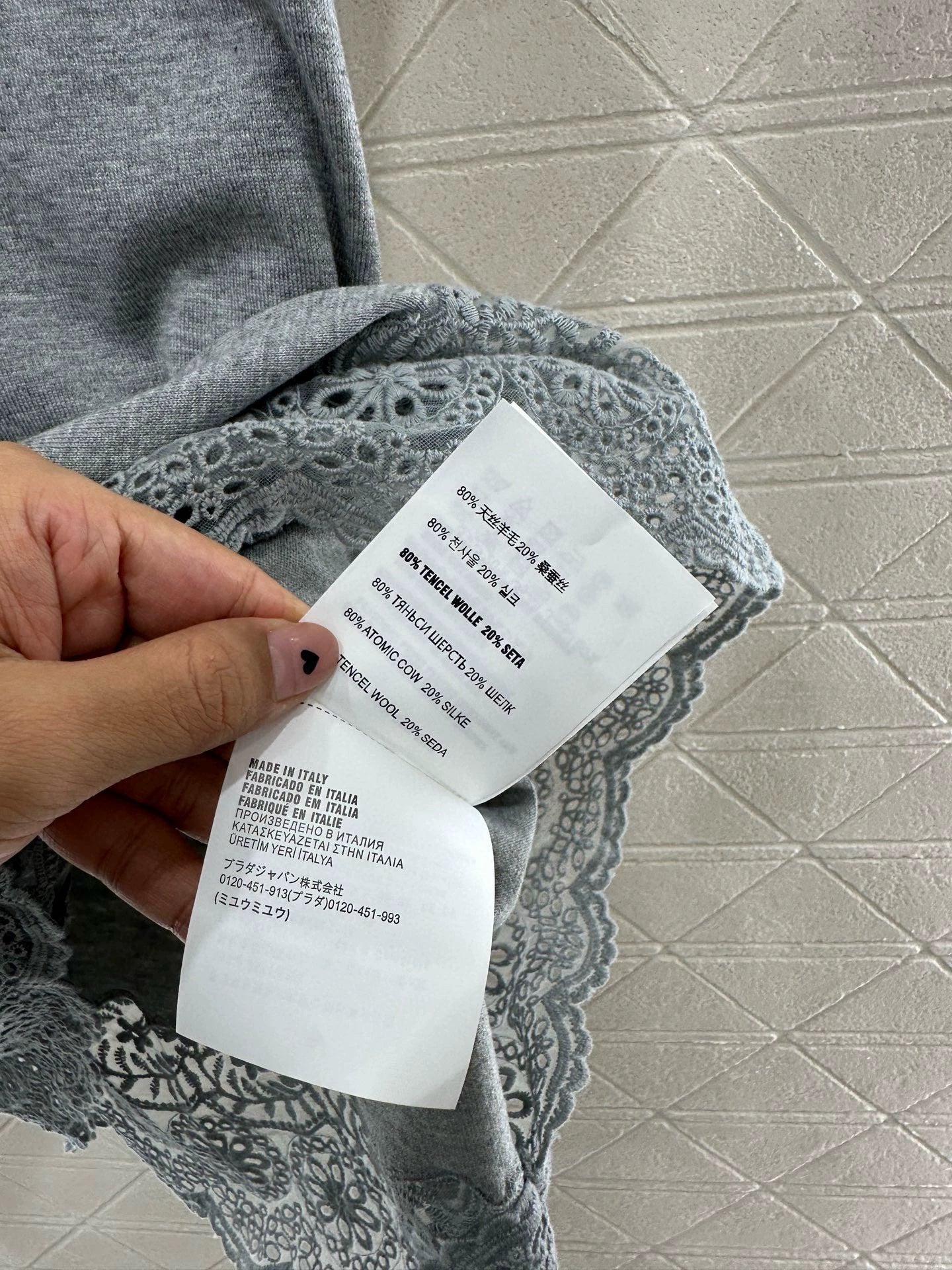 Silk wool yarn weaving texture advanced ice transparent comfortable knitted round neck short sleeve dress cut body use of fine crochet texture interweaving hem embellished with a circle of lace floral pattern and the chest letters logo echo sweet college style pull full highlight wearing a sense of senior Slim fit more skinny reveal loose tone highlighting the light luxury chic temperament