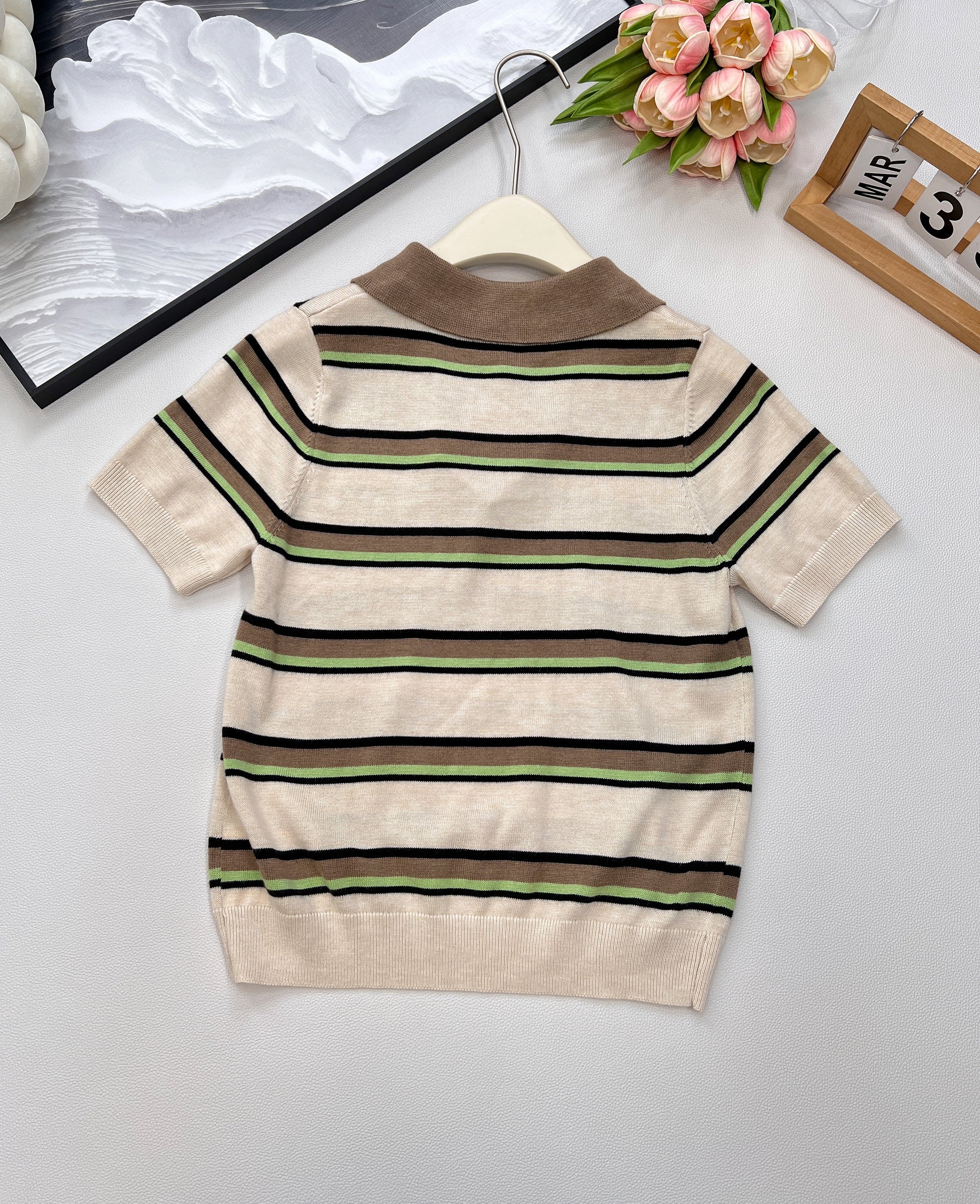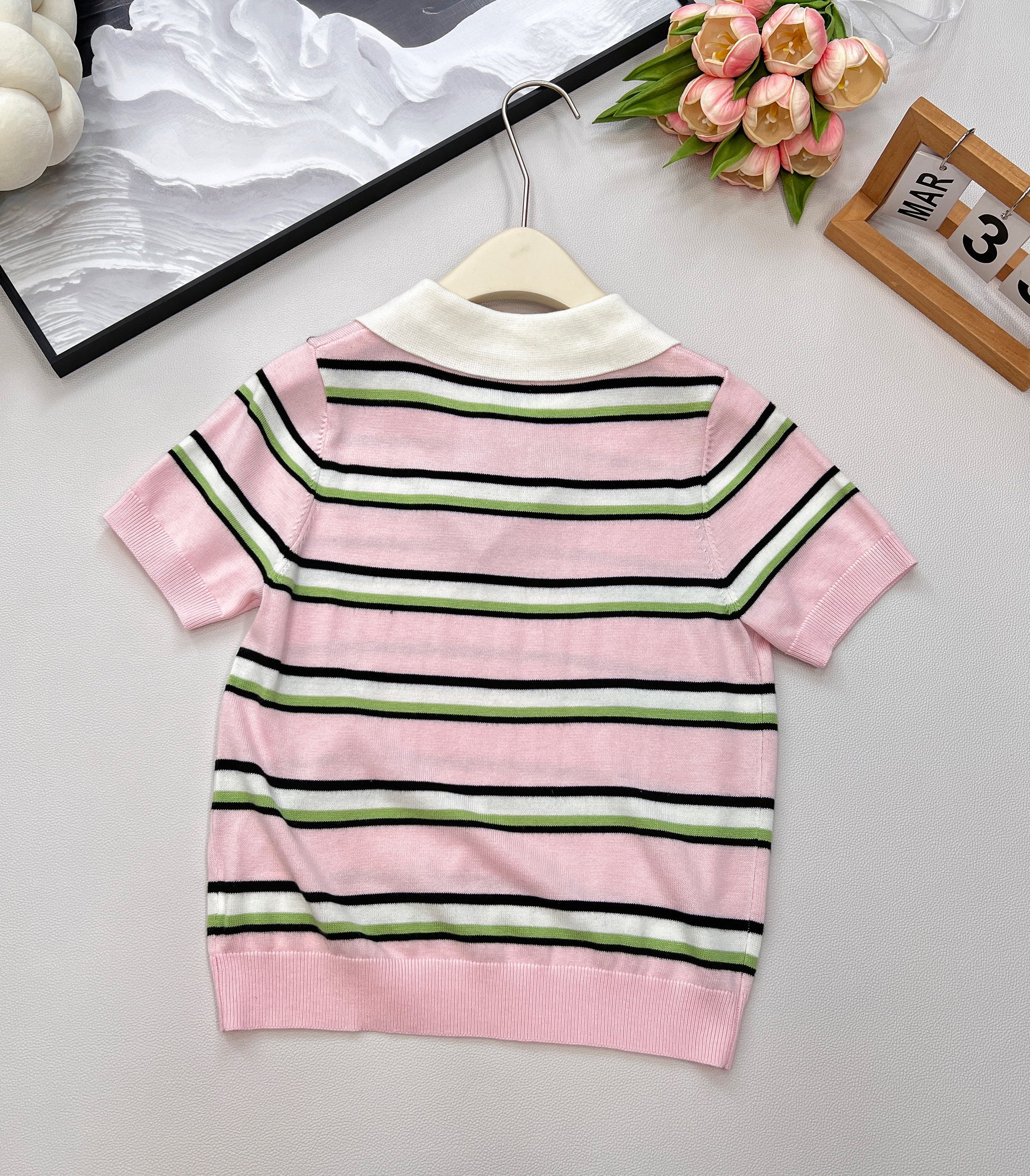 Contrasting stripes + Polo collar: a mix of classic college style elements, the pink/beige color scheme is fresh and advanced, with small buttons on the collar, creating a sweet and cool atmosphere~