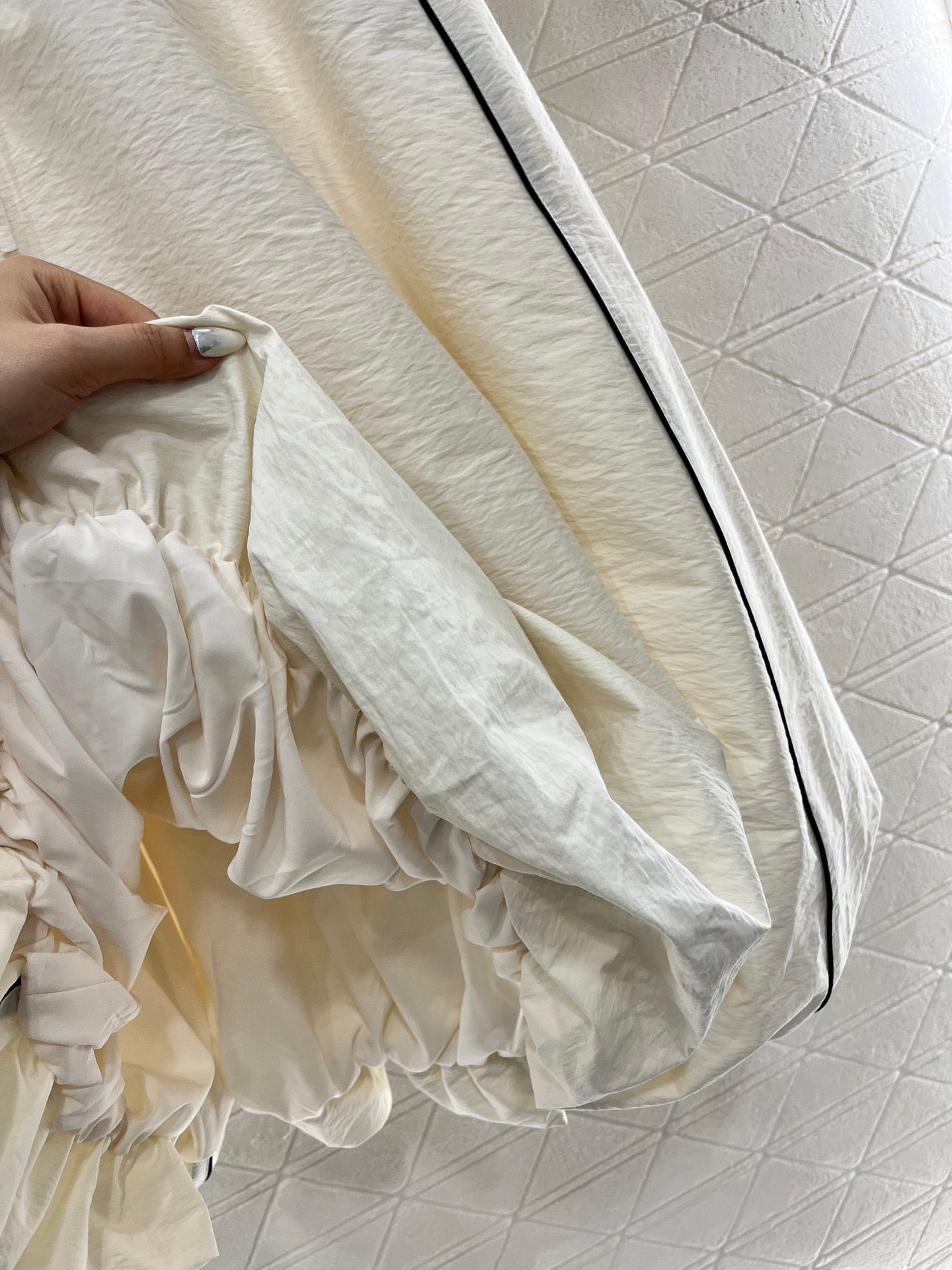Customized YB windproof and waterproof nylon material Breathable and more preferred material for summer wear High waist drawstring work skirt shape The skirt hem is gathered to create an umbrella-like tutu effect Outside leg pockets are outlined with color blocking and three-dimensional silhouettes to enrich the design Layers The waist and crotch are highlighted with a triangular metal label High-quality style Dress up a workwear sense of casual laziness style