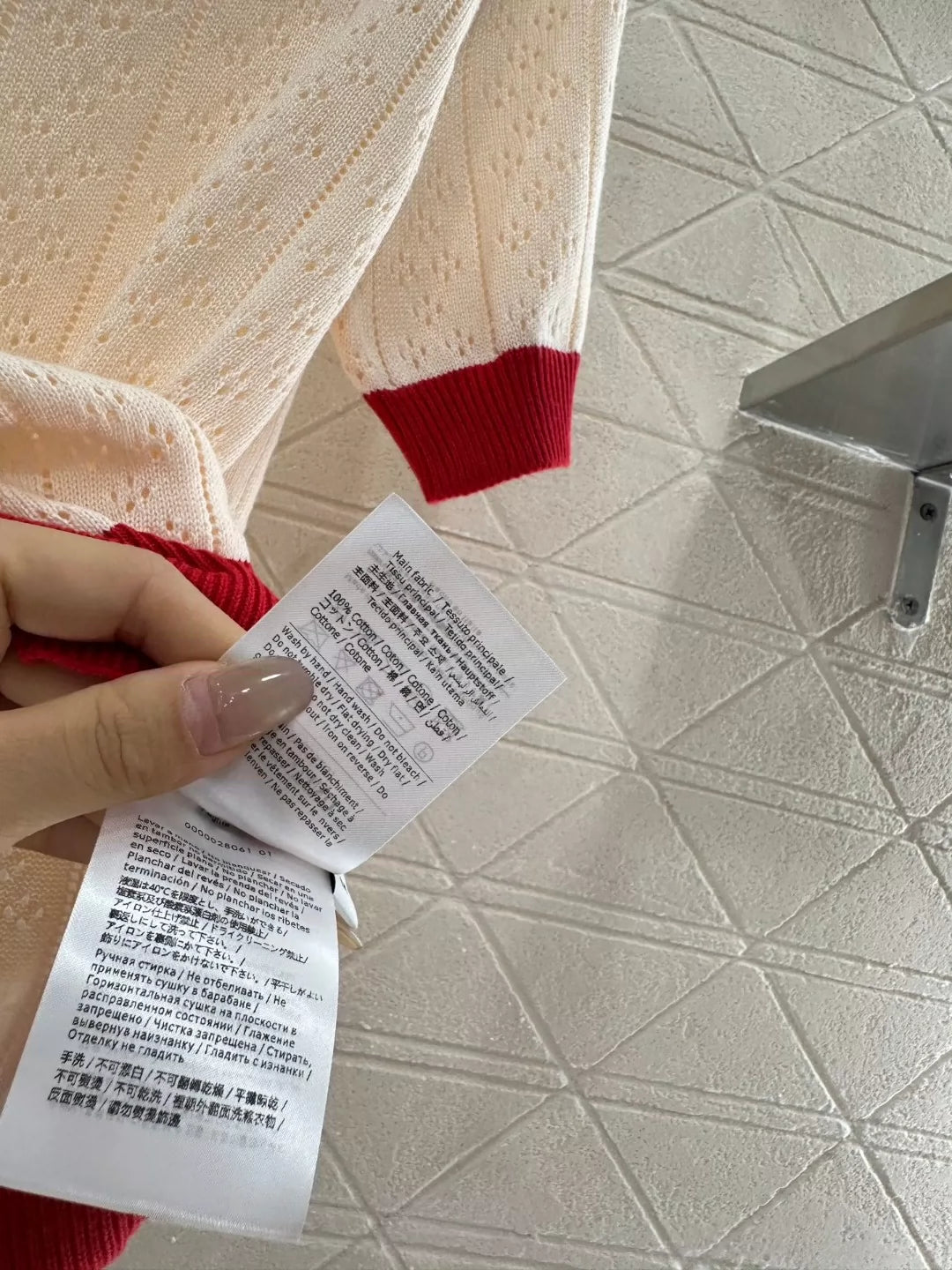 Cotton yarn weaving texture advanced breathable comfortable knitted lapel half-breasted top cut through the body using crochet texture interweaving outlined hollow vertical rows of texture pattern to highlight the sense of high quality to wear the edge of the color collision single side of the collar cherry logo embroidery decorations to highlight the loose tone to highlight the luxury chic temperament elastic elastic to highlight the delicate wearing thin fit body-hugging version of the shape can be worn alone and layering can be