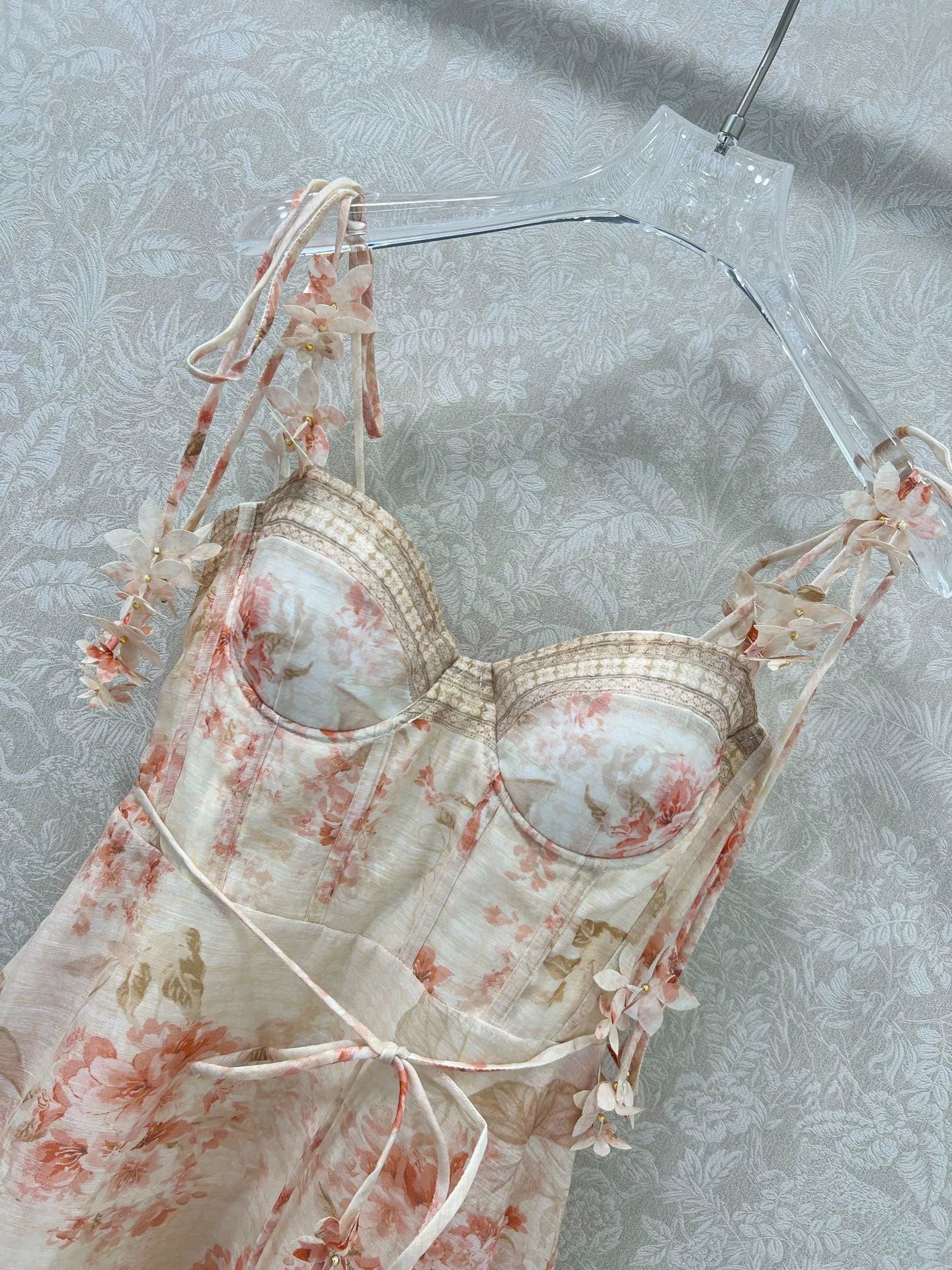 Shoulder straps stapled diamonds three-dimensional flower decoration chest stapled diamonds waist pleats outlining the waistline to brighten up the eyes, invisible zipper closure, waist waist Summer atmosphere pull full of flourishing flowers clusters with this cloth thin rope belt Oversized pendulum skirt fairy this fairy 😍 the overall senior and show retro charm temperament.