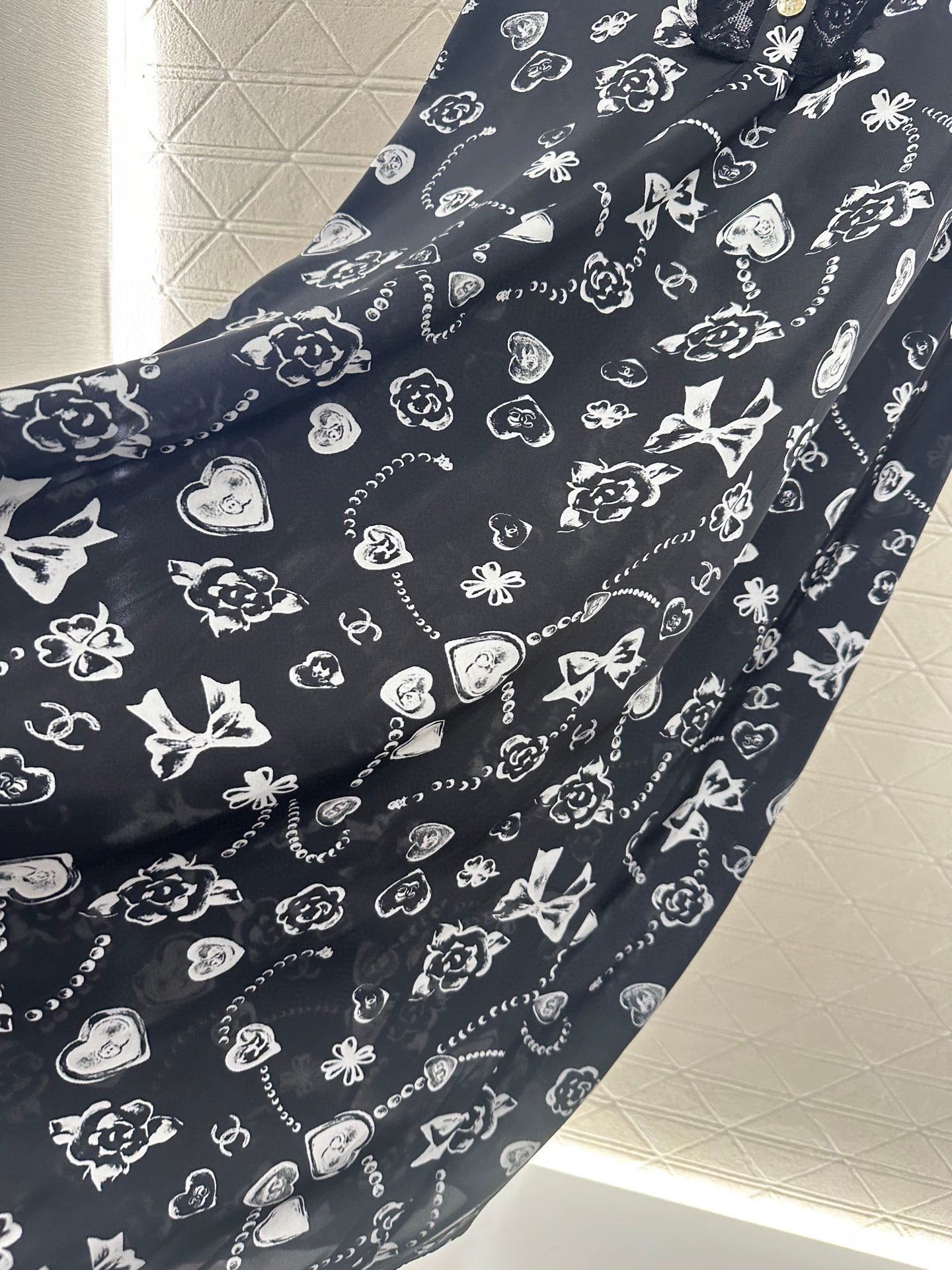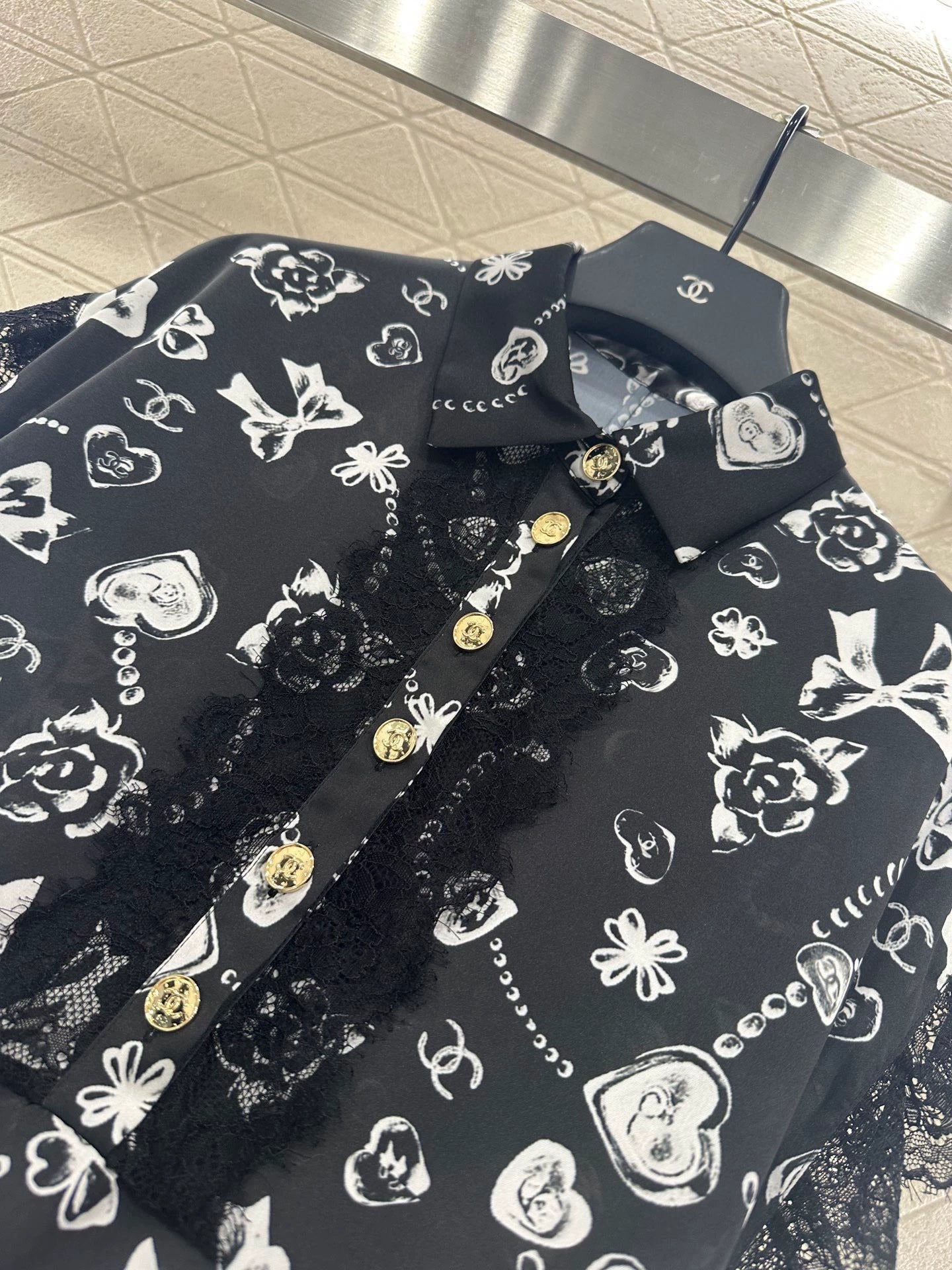 Customized YB imported twill fabric with a lustrous, smooth, and stylish drape. Lapel, half-open, short-sleeved dress cut. All-over prints of classic Xiangjia motifs, such as camellias, hearts, and double C chains, enhance brand recognition and create a strong holiday vibe. Lace trimmings at the cuffs enhance the arm contours, creating a stylish and fashionable look. The lightweight feel is perfect for summer. Custom fabrics and accessories. Look for the latest version.