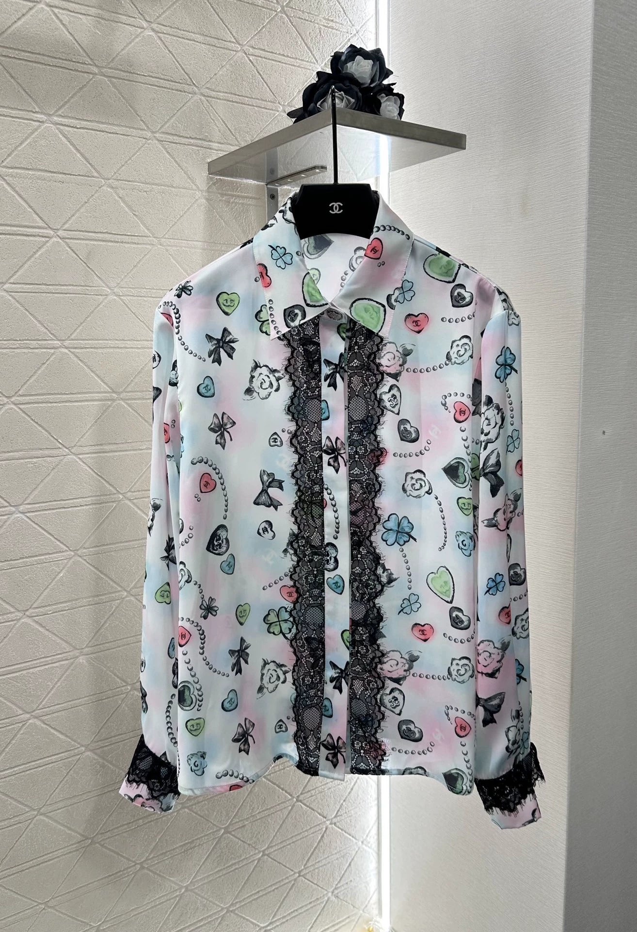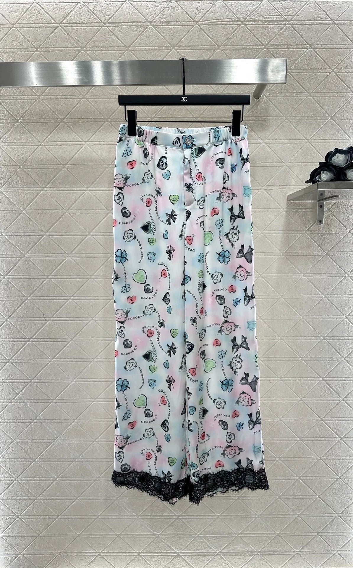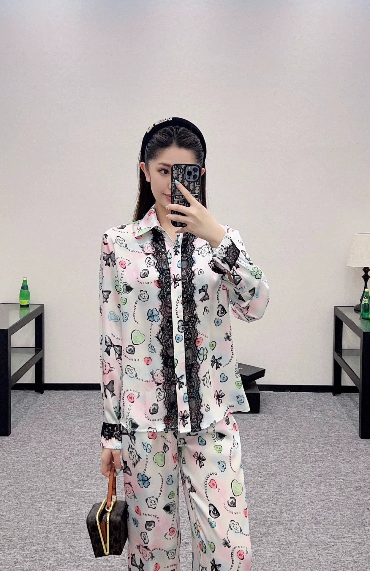 Customized YB imported twill fabric for a lustrous, smooth, and stylish drape. This lapel-collared, long-sleeved shirt and pant set features all-over prints of classic Xiangjia motifs, including camellias, hearts, and double C chains, enhancing brand recognition. The pale pastel blue base creates a strong holiday vibe. Lace trimmings on the front and cuffs create a striking accent, complementing the trouser hem for a stylish and fashionable look. The lightweight feel is perfect for summer, concealing body contours and creating a slimming effect. Custom fabrics and accessories available. Look for the high-end version.