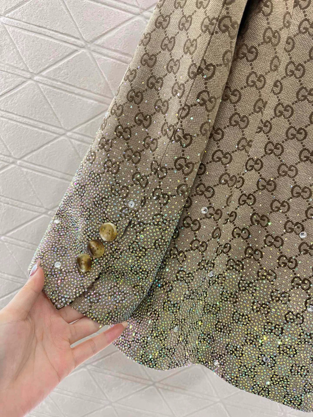 Customized YB imported jacquard material, high quality, lapel collar, mid-length blazer, double G jacquard printed all over the body to form a collision, gun-barge collar and shoulder pads to make the shape more advanced and sturdy, cuffs and hem are embellished with heavy-duty rhinestones, and the design is richly layered and gorgeous, creating a brand exclusive sweet and cool style, and the exquisite satin treatment inside is a must-have fashionable item in the spring and summer, and with the same style of jacquard shorts, the double G belt to narrow the waist and show the length of the legs, and to increase the sense of modelling. The legs of the pants are decorated with the same diamonds for a more coordinated and chic look. Customized fabrics and accessories.