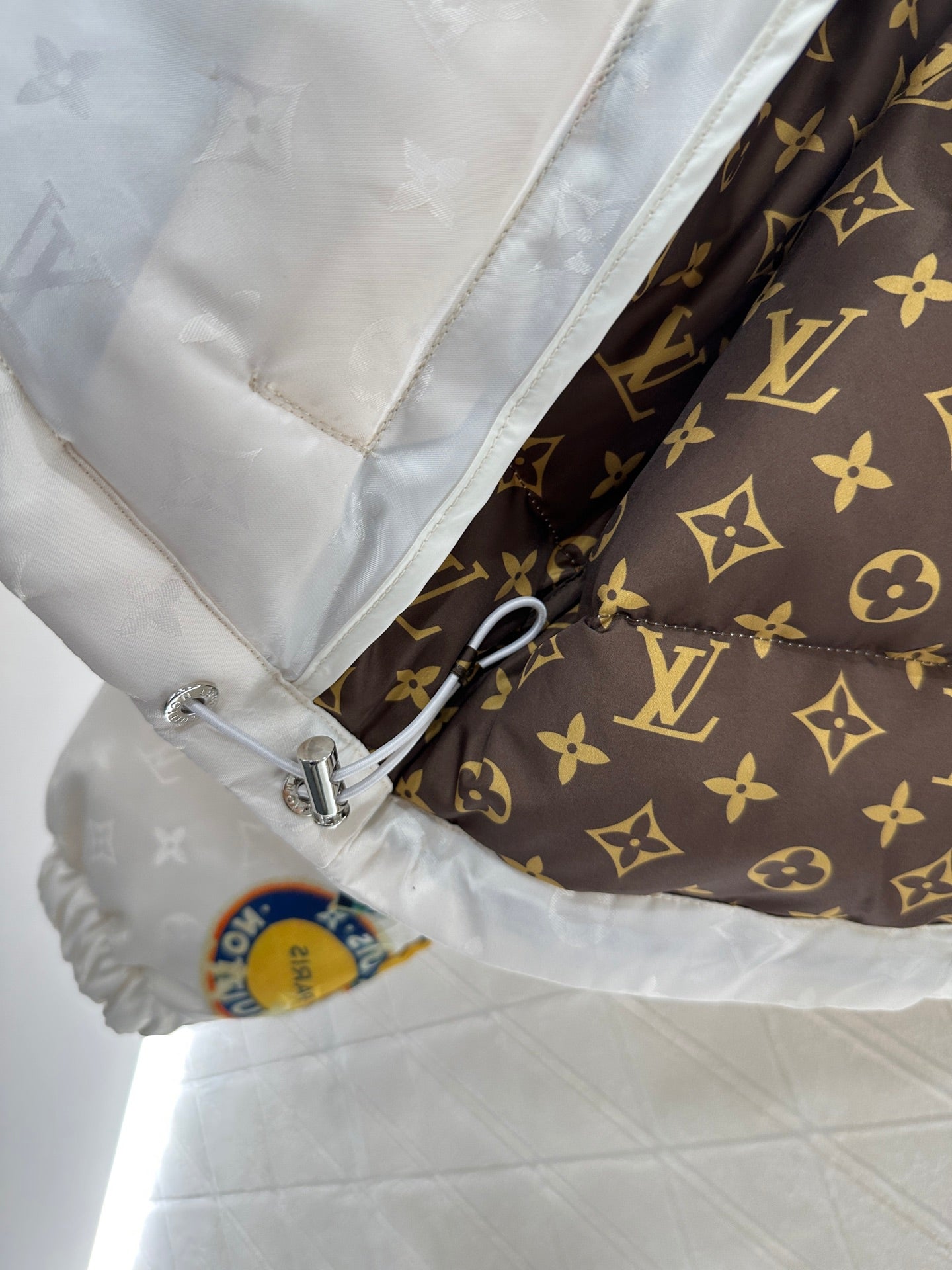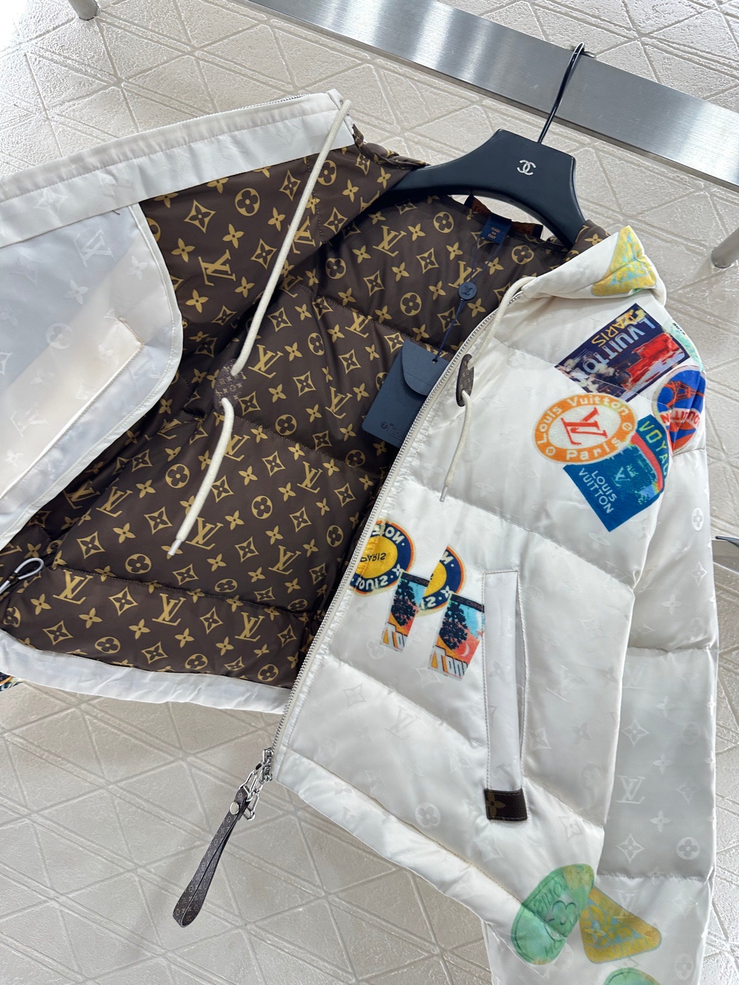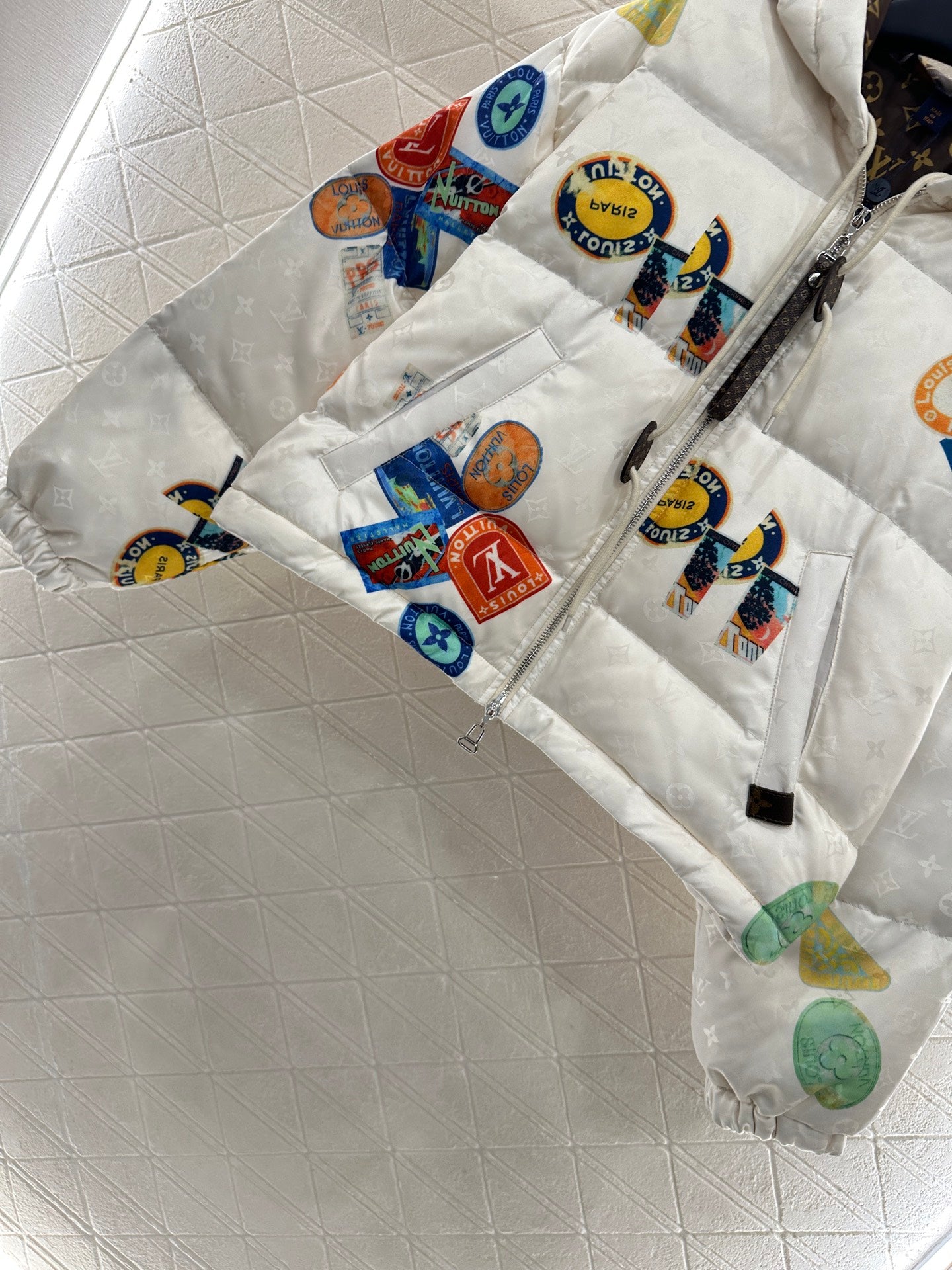 Made of windproof and water-resistant nylon and polyester, with a white duck down lining.