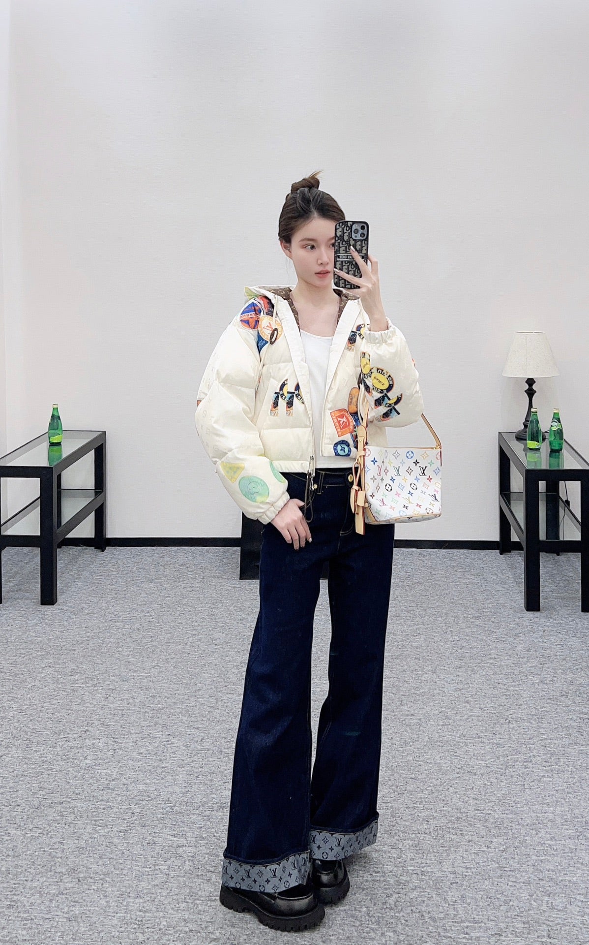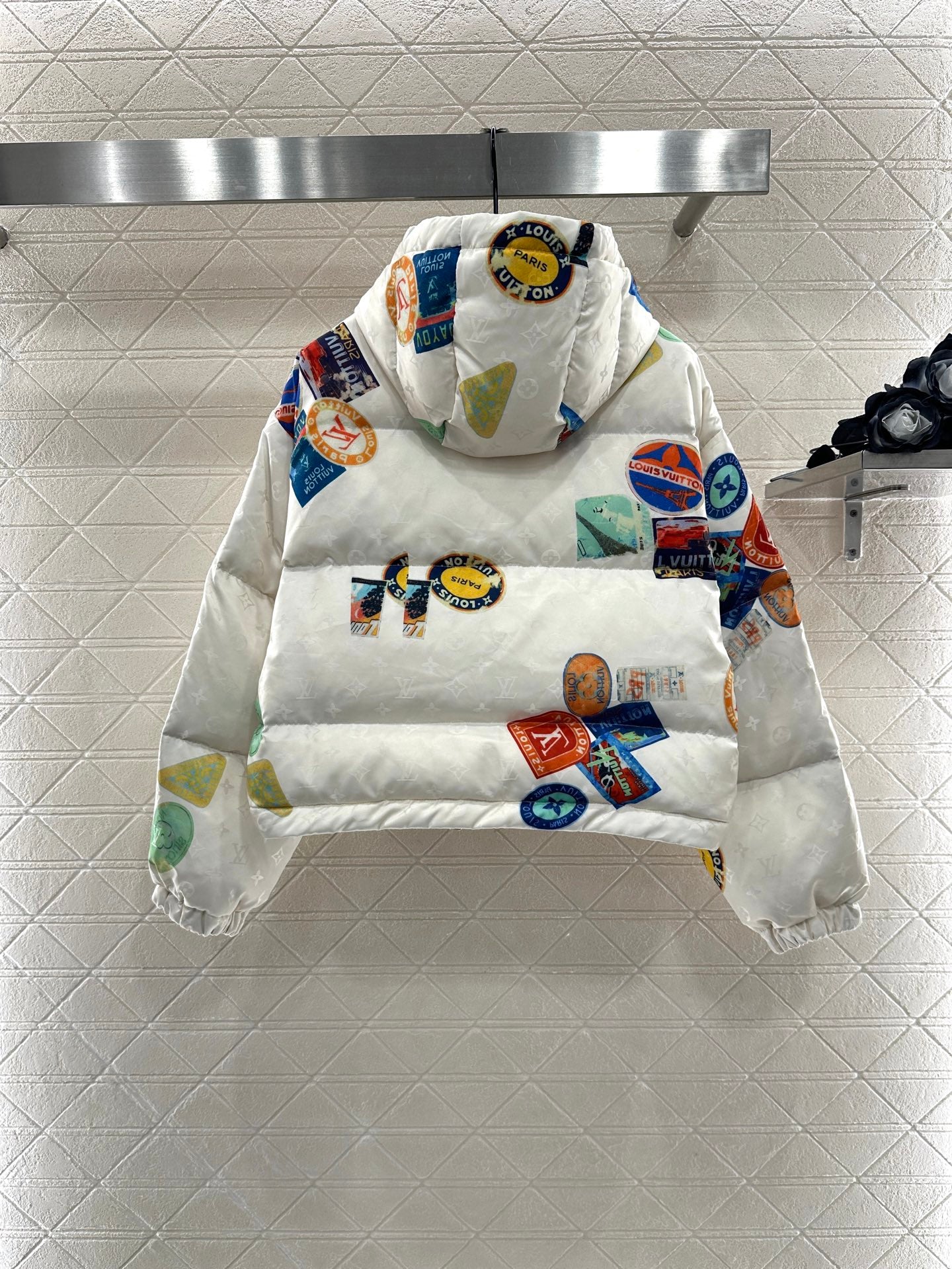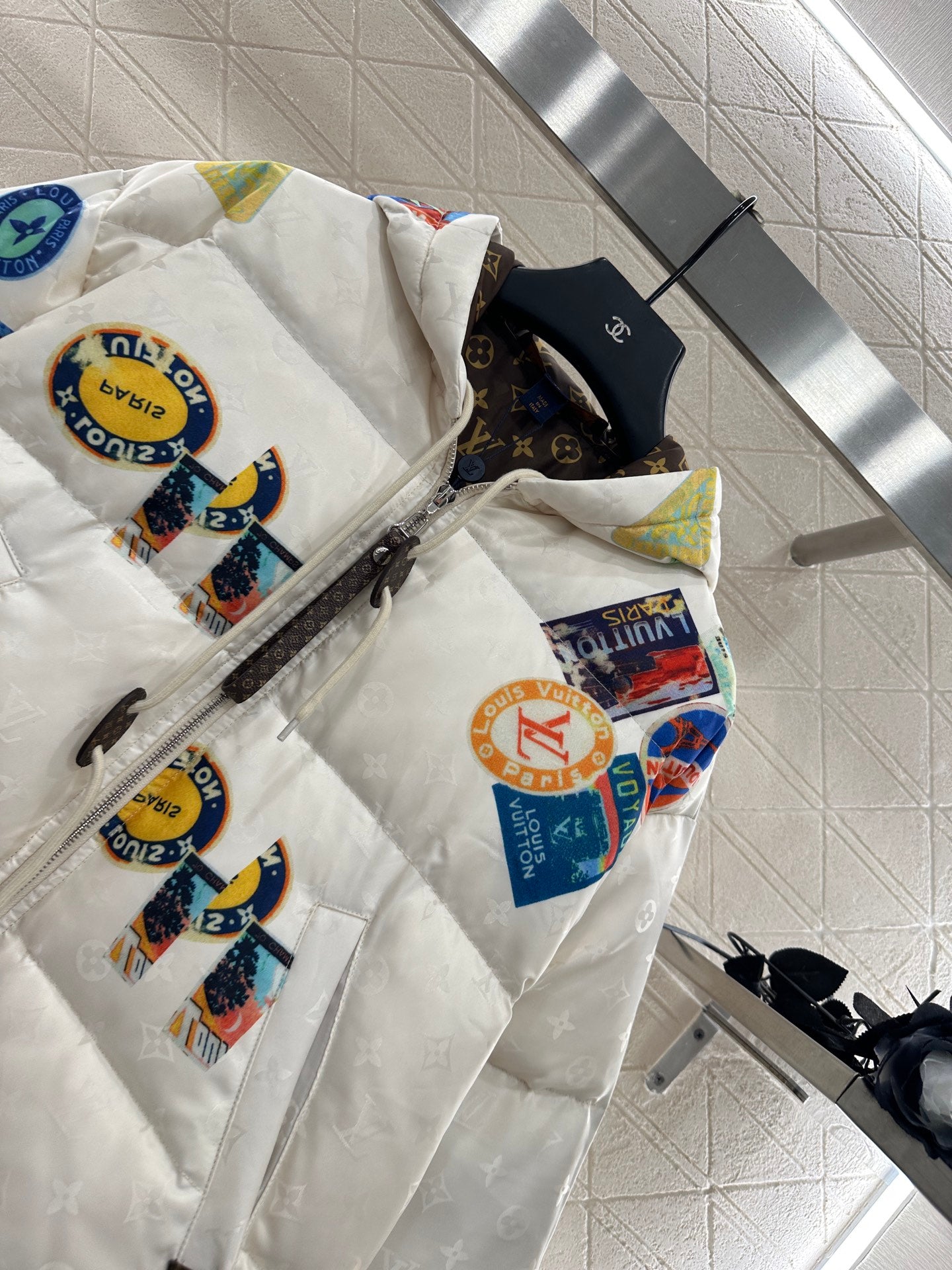 Made of windproof and water-resistant nylon and polyester, with a white duck down lining.