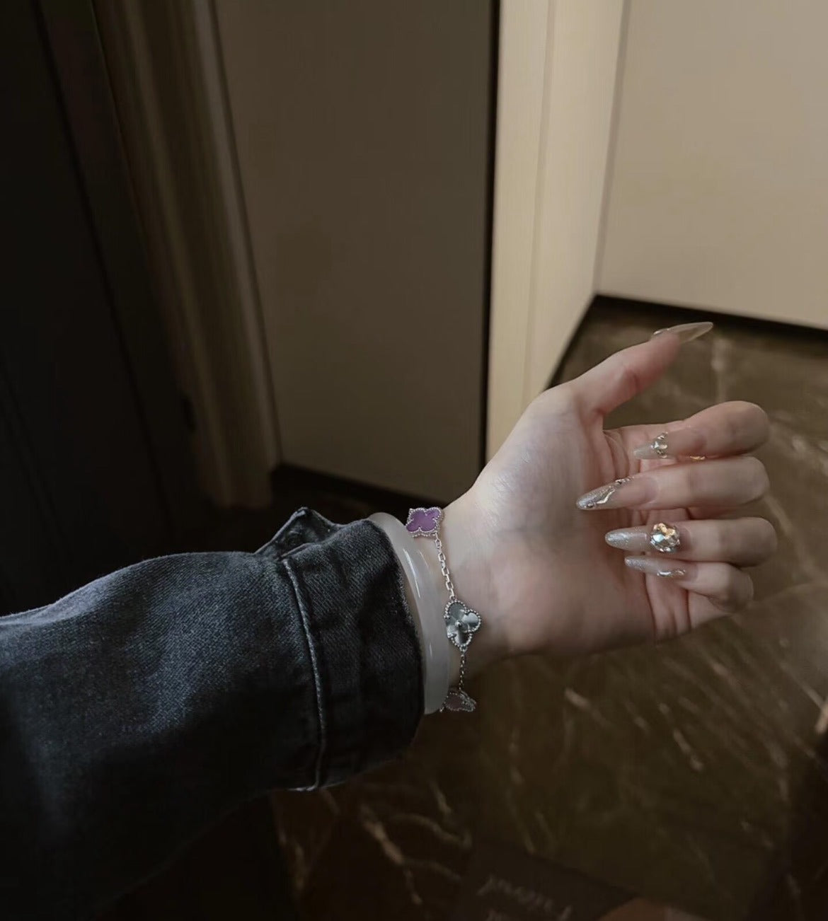 💜 With the classic four-leaf clover as the modeling element, it means good. The four-leaf clover symbolizes love, health, wealth and happiness, carry this luck with you. The violet mother-of-pearl on the 👀 bracelet is the finishing touch. Each piece of mother-of-pearl has been carefully selected, and its color is like a dreamy purple river of stars ✨ from deep and rich purple to soft and elegant pink purple natural transition, full of mysterious and romantic atmosphere. White Gold Bracelet