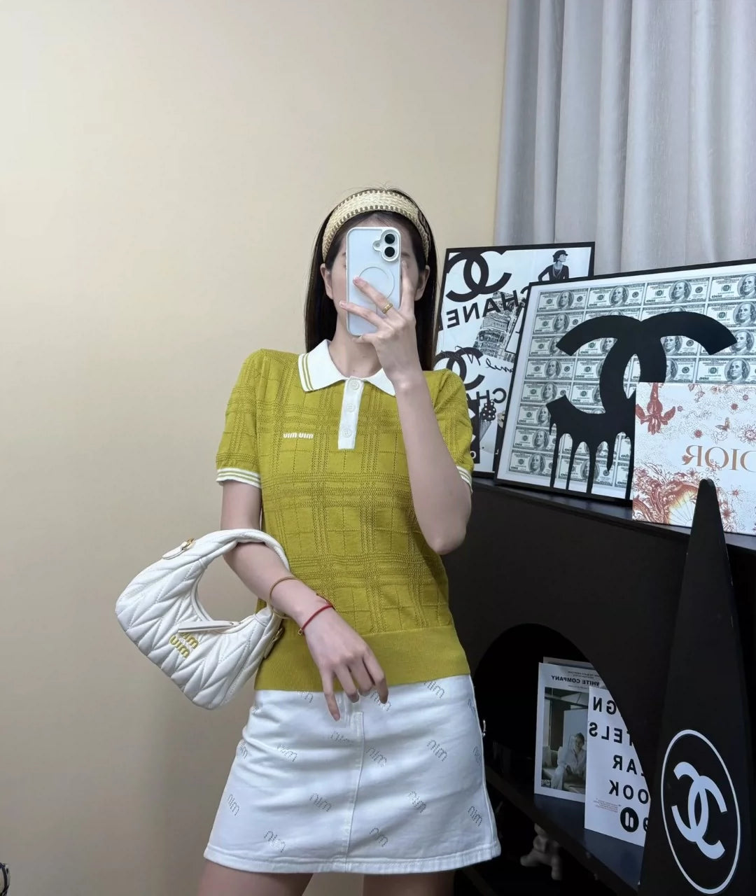 M 25 New Clashing Buttons Lapel Short Sleeve Knit (White Pink Yellow)
