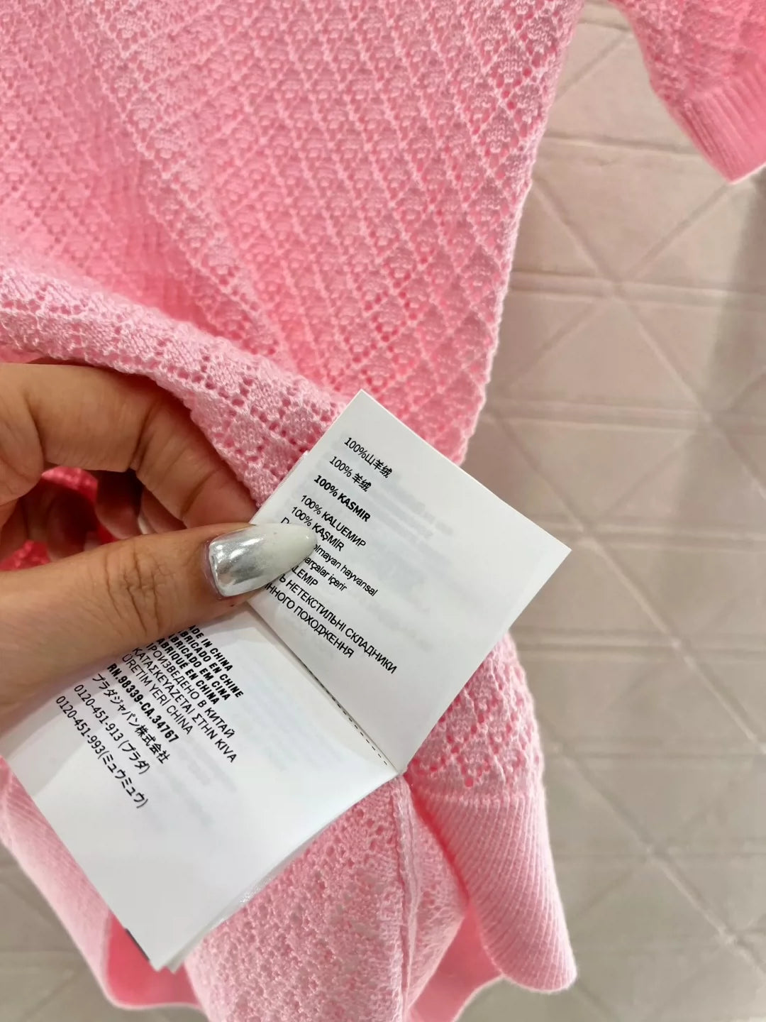 cashmere yarn weaving texture premium comfort high knit short-sleeved top tailoring body using openwork crochet texture interweaving outlined wave diamond lattice pattern highlighting wearing a sense of sophistication collar cuffs and hem with thread lace elastic elastic more delicate wearing skinny fit loose shape accommodating body figure highlighting the loose tone chest clash of colors embroidery logo highlighting the light luxury and fashionable temperament.