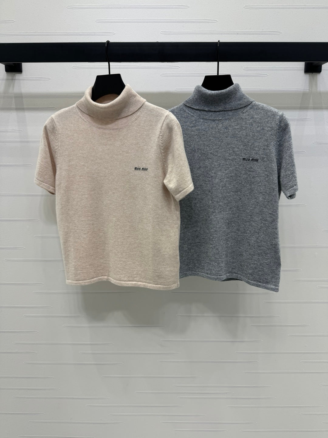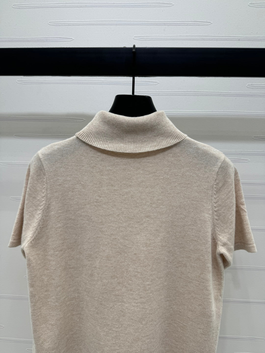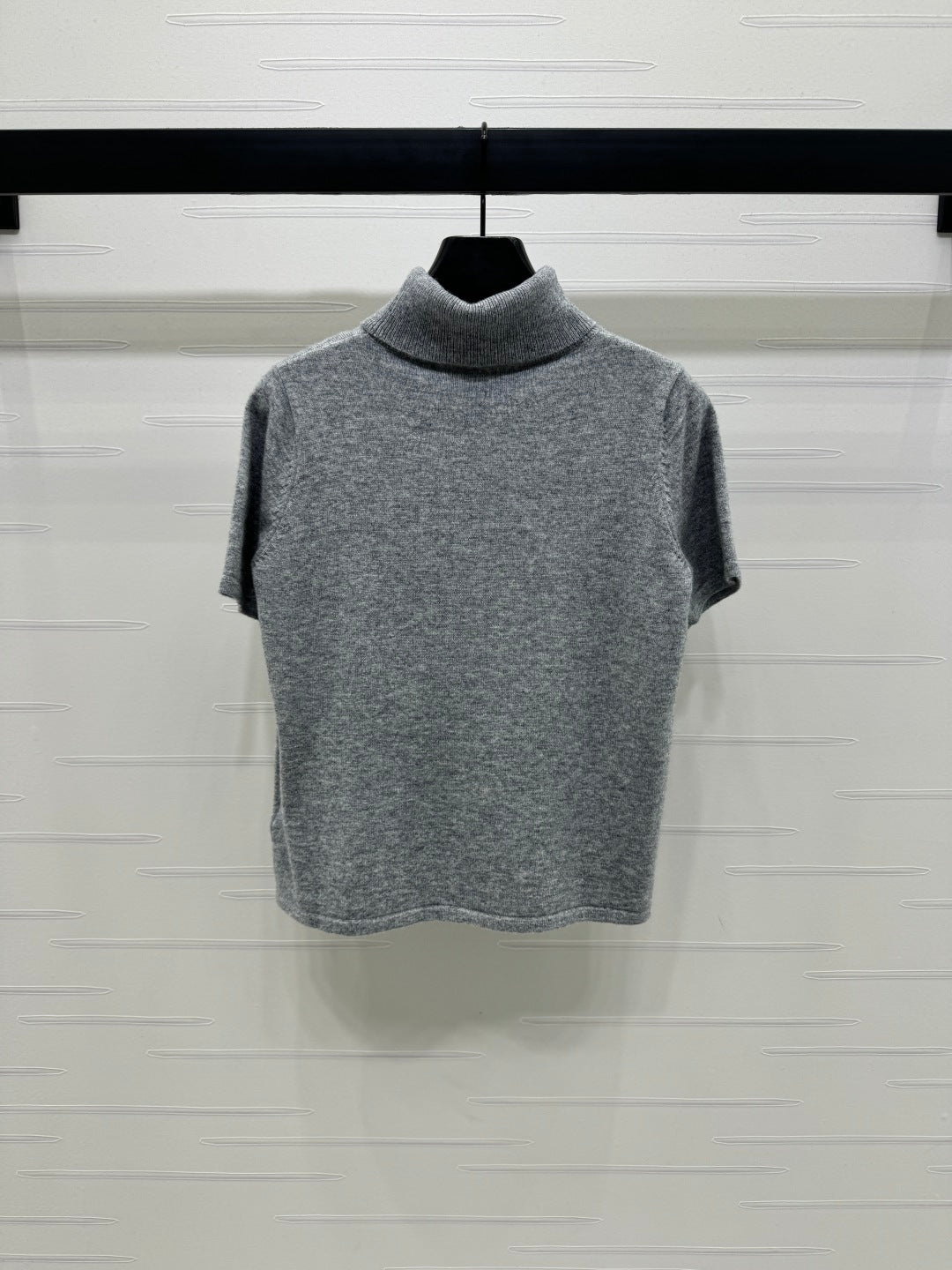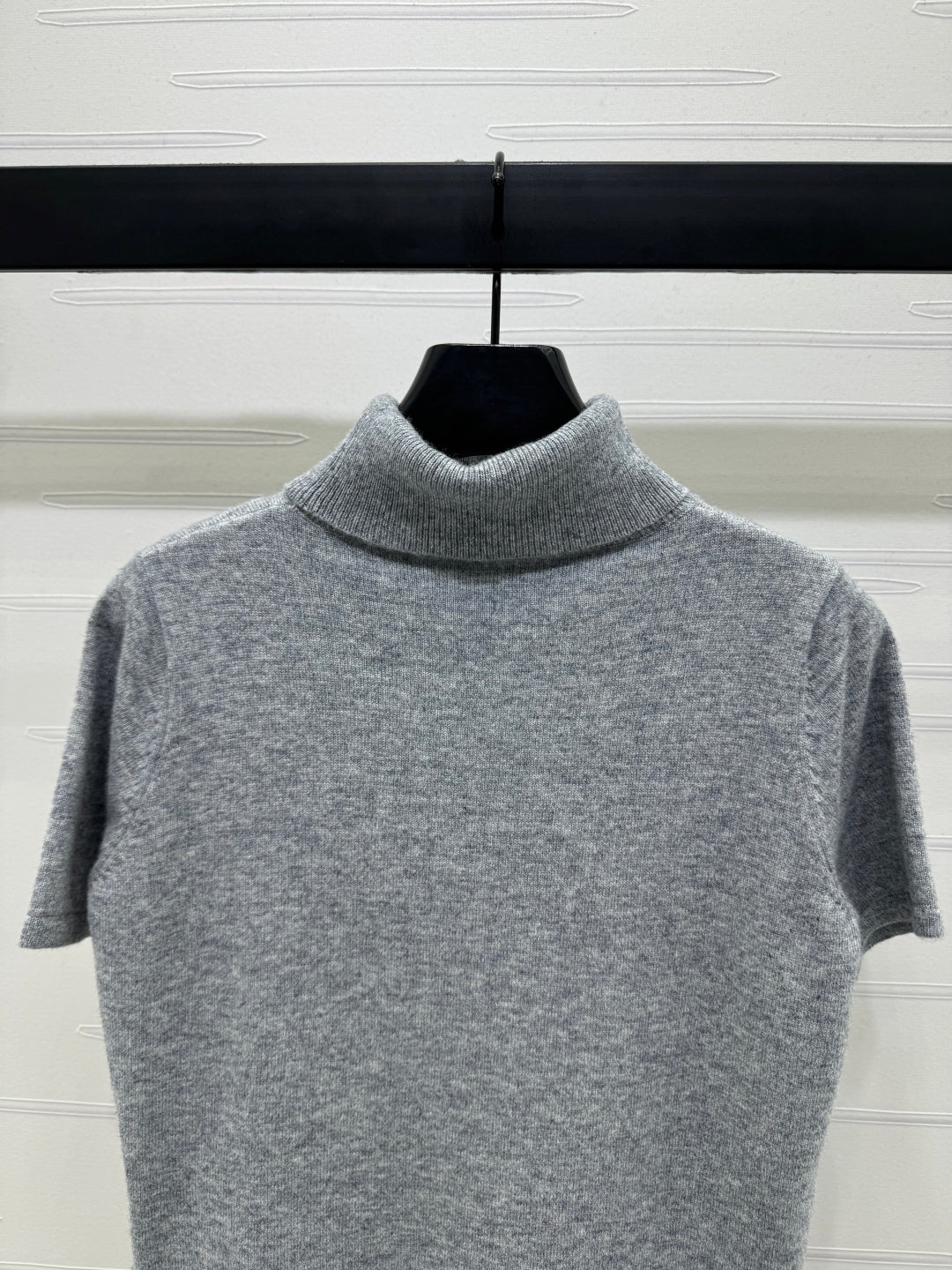 Custom wool yarn material, delicate texture, soft and comfortable, high collar knitted short sleeves, vertical striped knitted texture throughout, with elastic fabric, fits the body shape more slimming and curvaceous, decorated with letter logo on the chest to show the brand tone, versatile style regardless of age and skin color, match with skirts and pants, suitable for slimming, fashionable and retro style