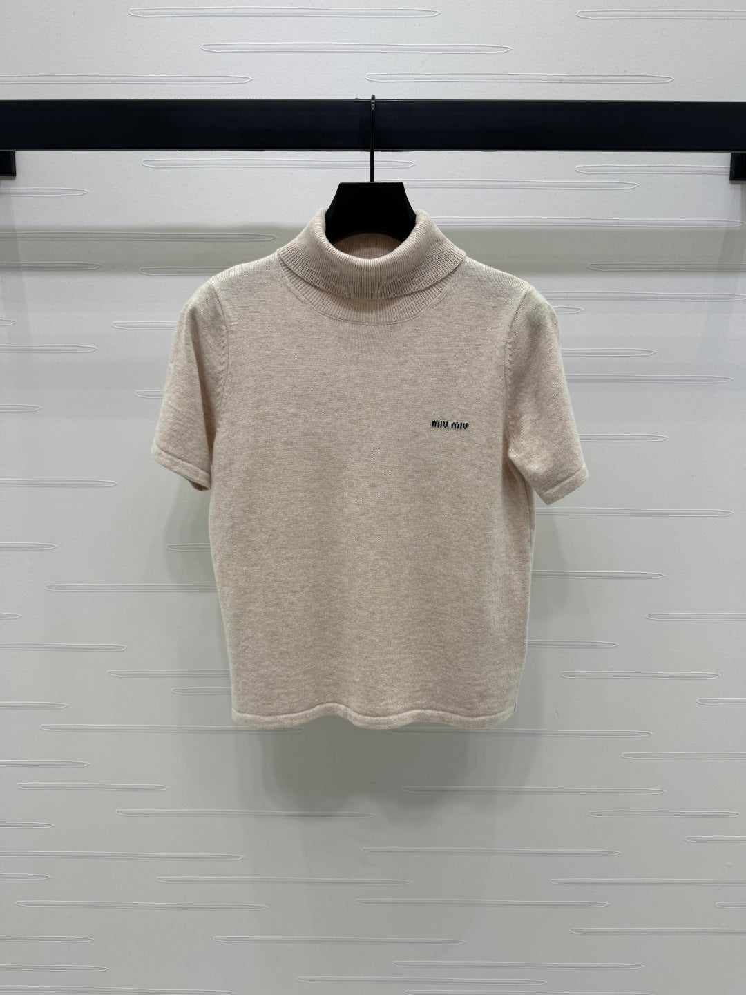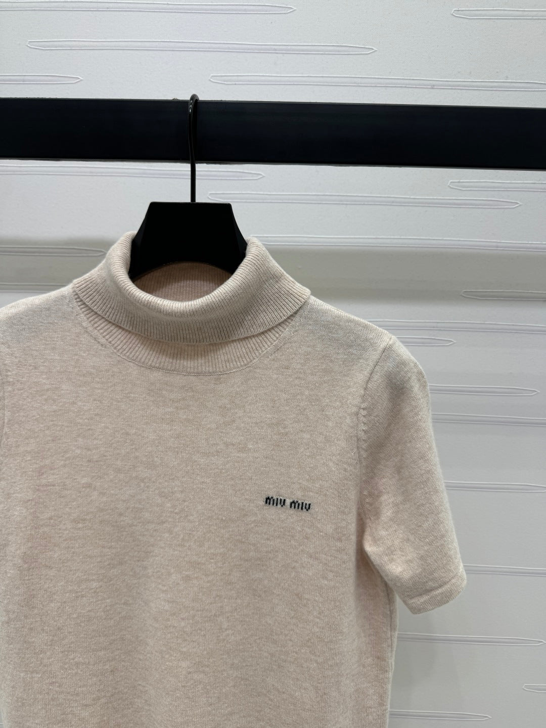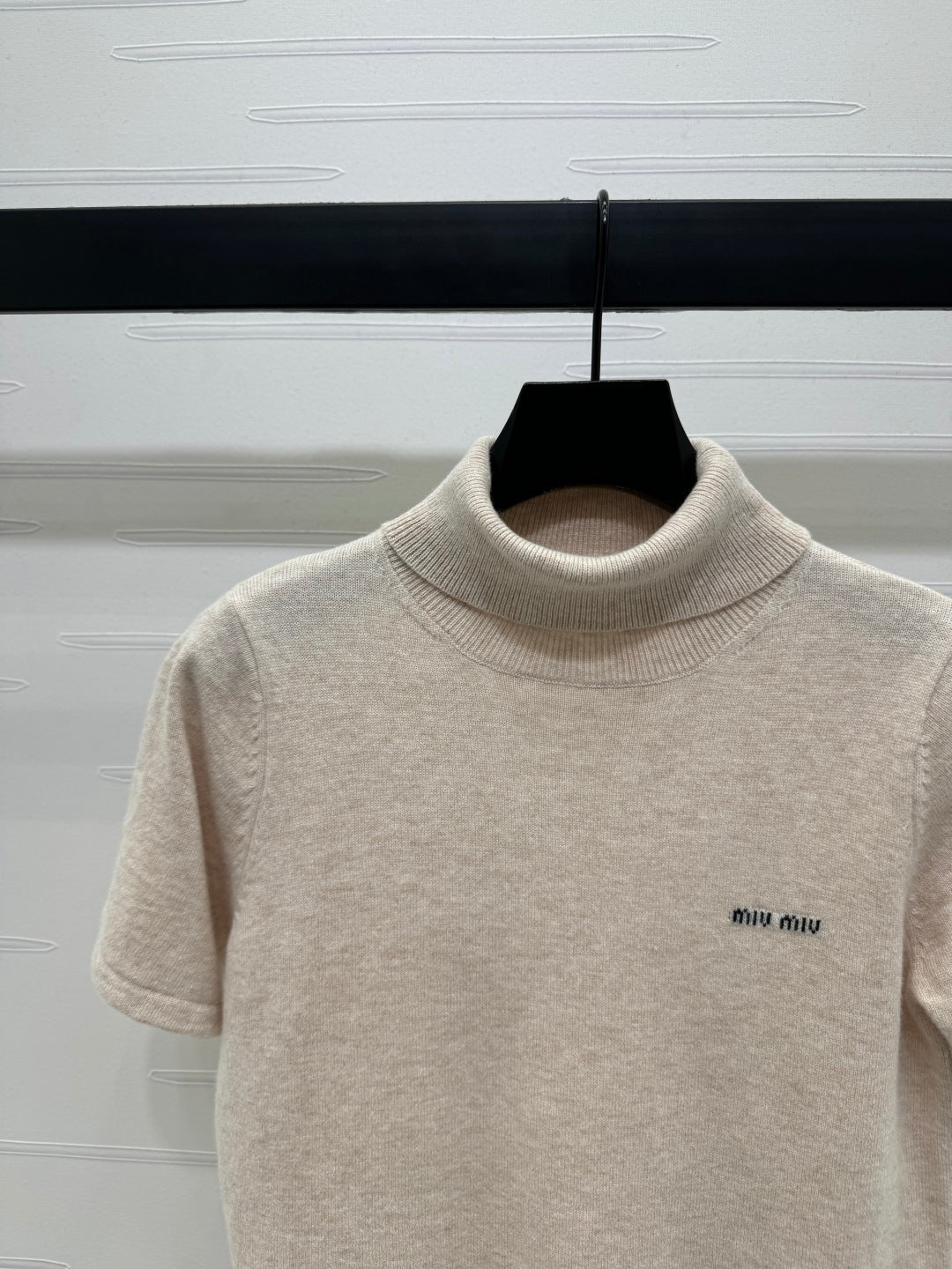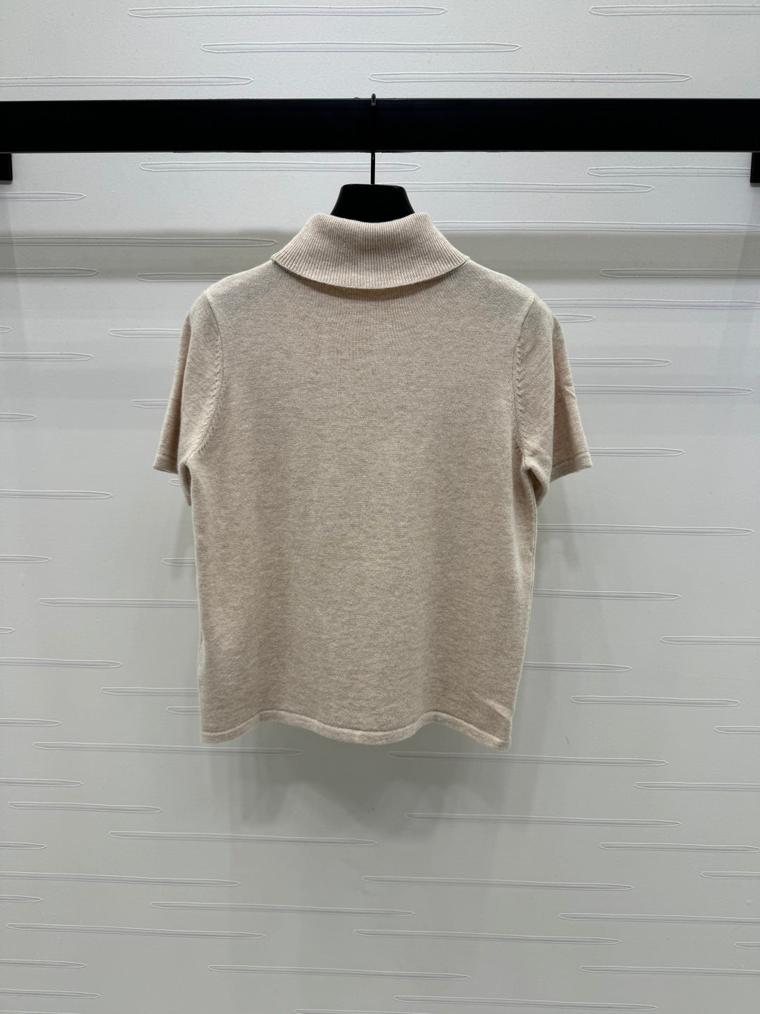 Custom wool yarn material, delicate texture, soft and comfortable, high collar knitted short sleeves, vertical striped knitted texture throughout, with elastic fabric, fits the body shape more slimming and curvaceous, decorated with letter logo on the chest to show the brand tone, versatile style regardless of age and skin color, match with skirts and pants, suitable for slimming, fashionable and retro style