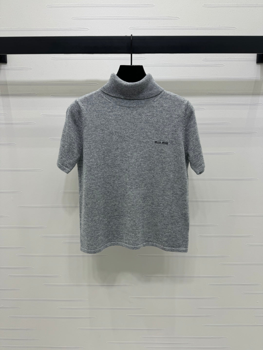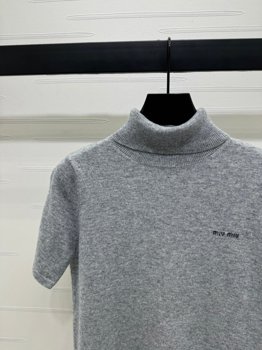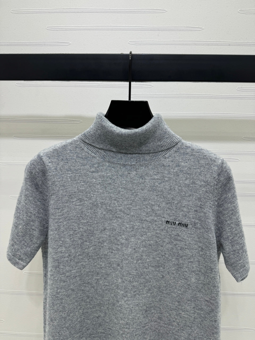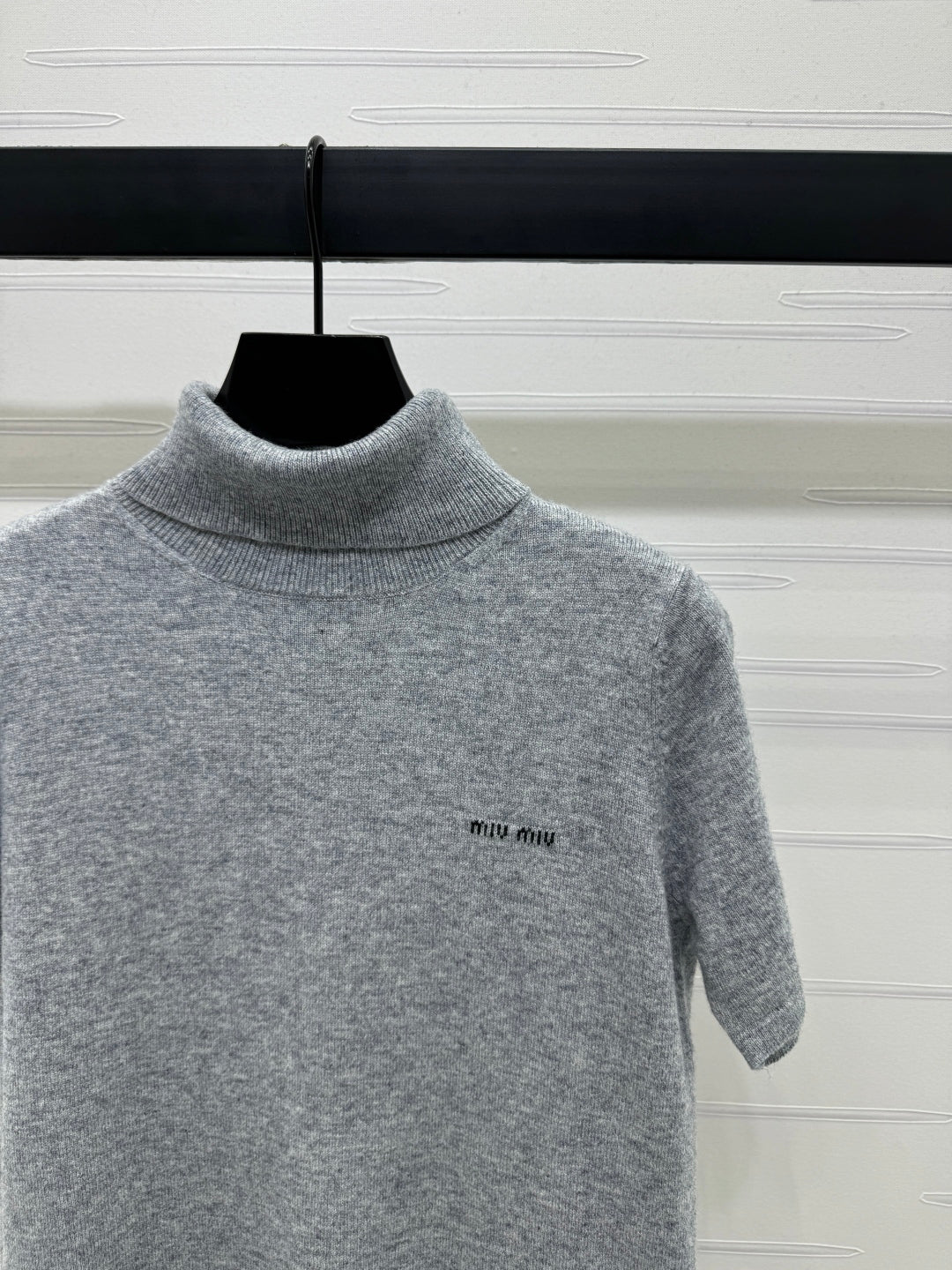 Custom wool yarn material, delicate texture, soft and comfortable, high collar knitted short sleeves, vertical striped knitted texture throughout, with elastic fabric, fits the body shape more slimming and curvaceous, decorated with letter logo on the chest to show the brand tone, versatile style regardless of age and skin color, match with skirts and pants, suitable for slimming, fashionable and retro style