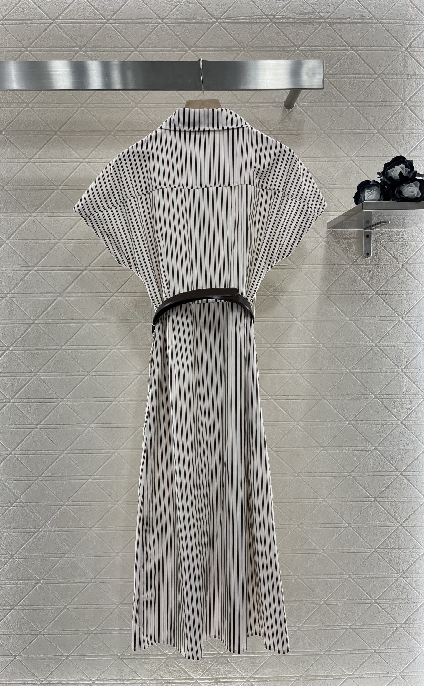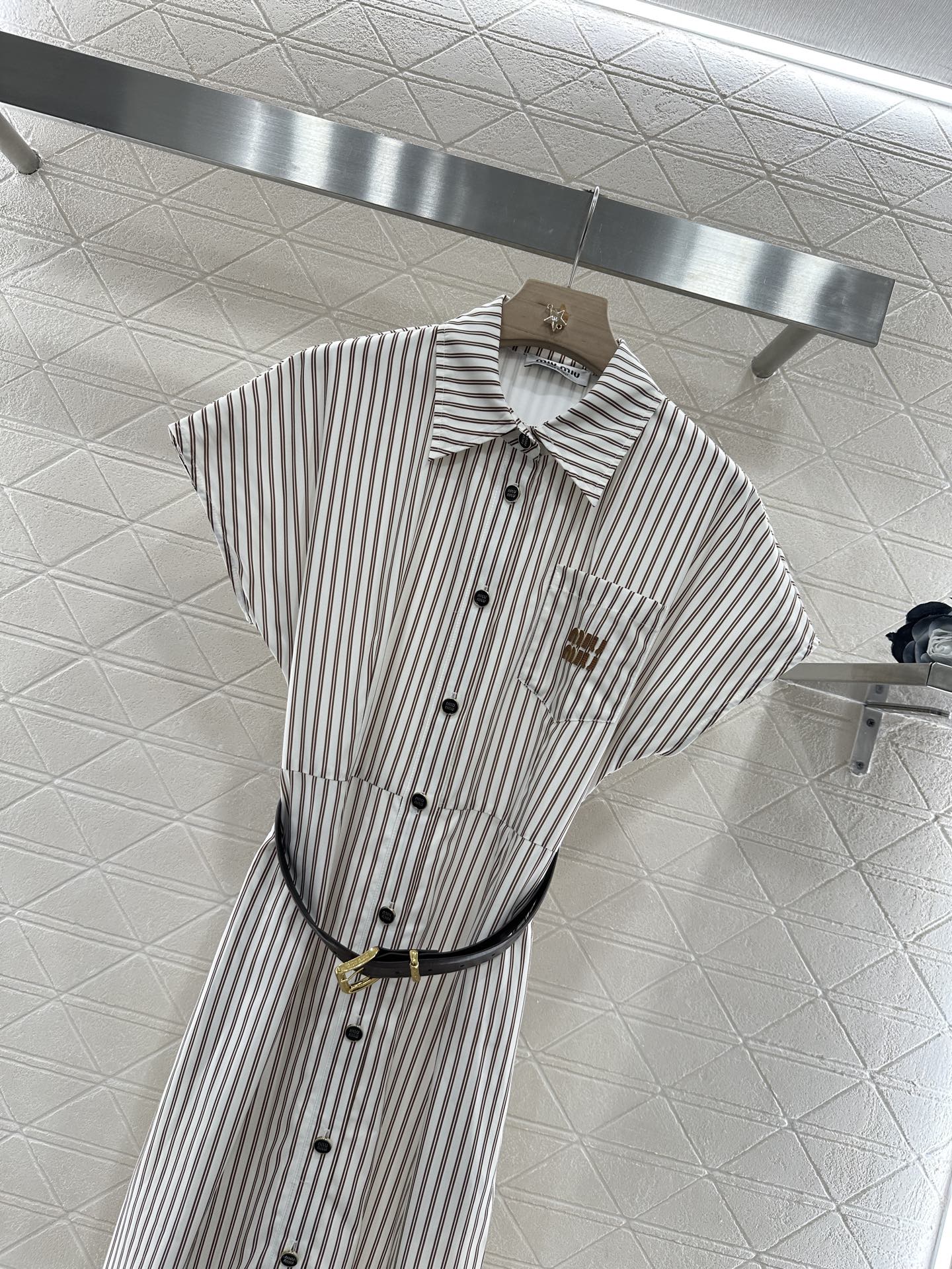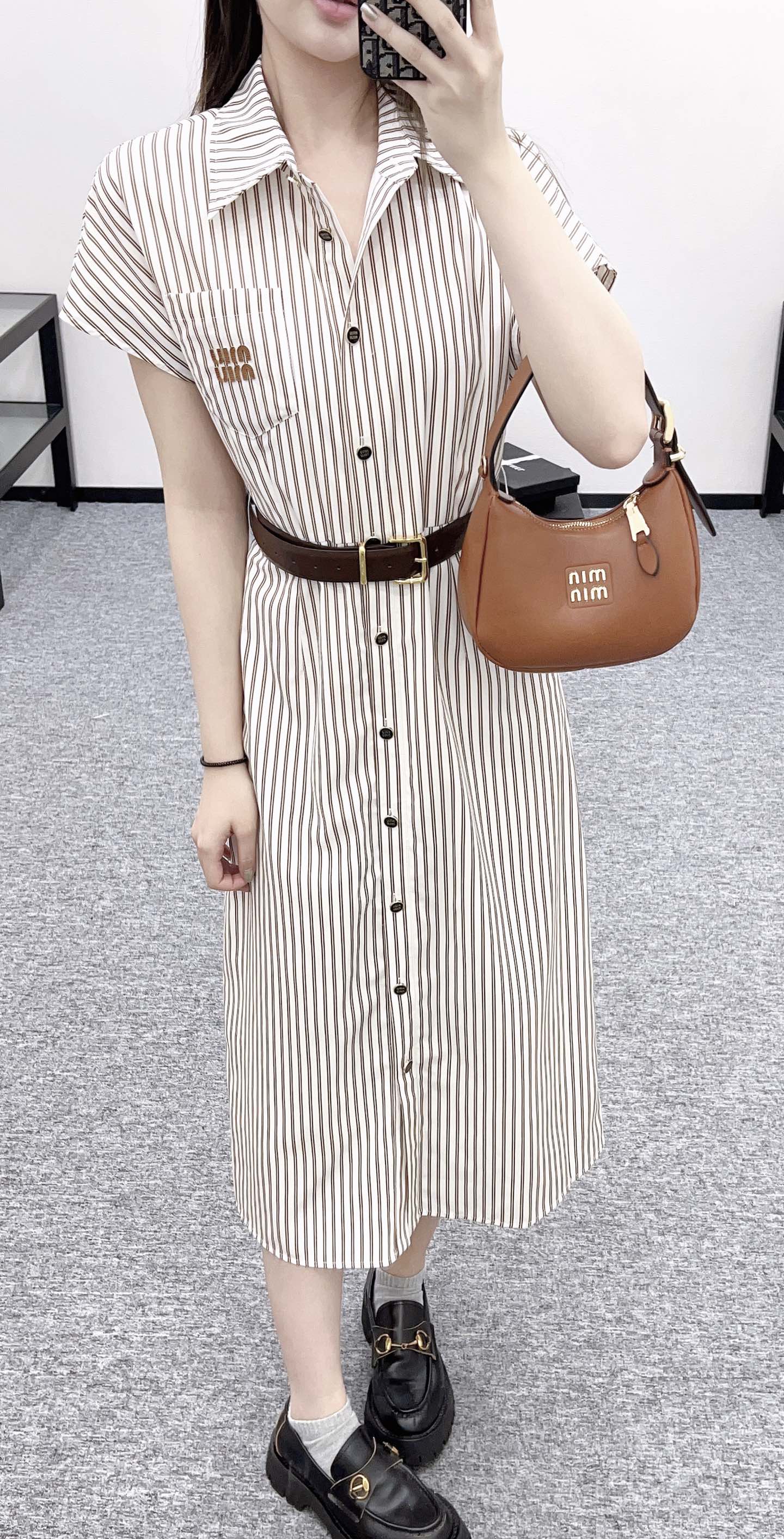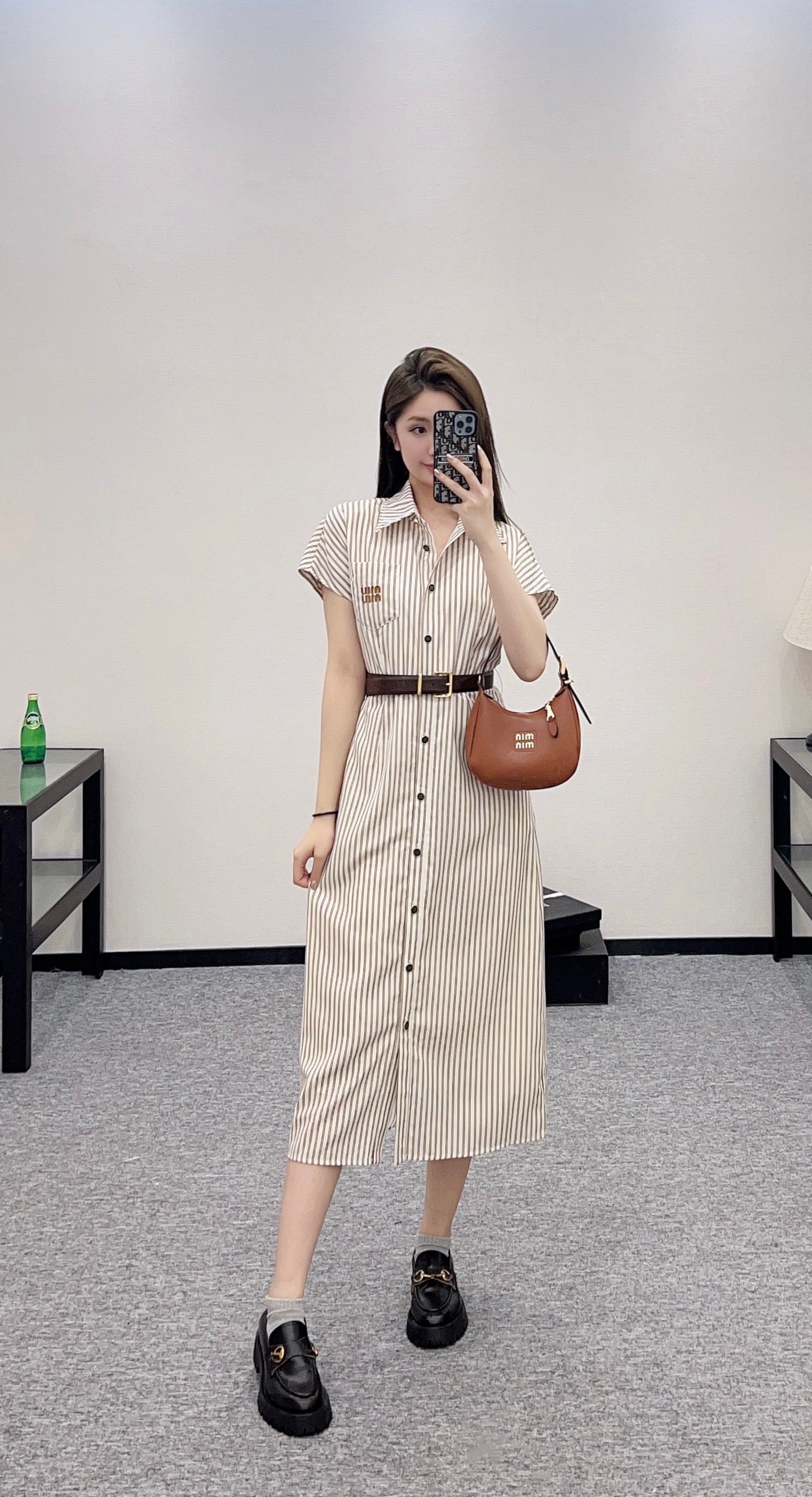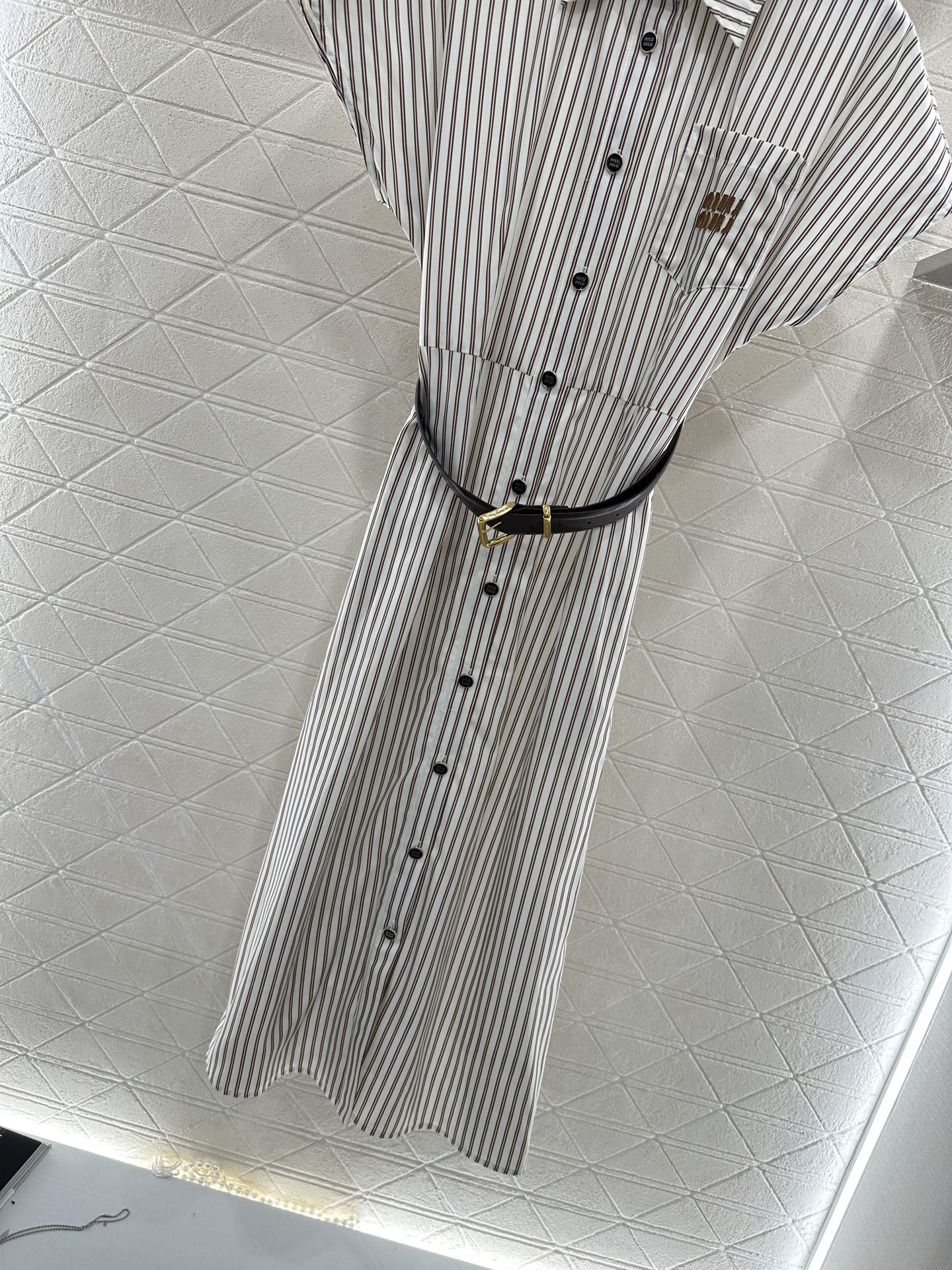 Customized YB imported twill material, comfortable and delicate texture, smooth and stylish, open-front short-sleeved dress cut, vertical stripes all over the body, neat and slim cut, waist-cut to slim the waist, with a belt to highlight the proportion advantage of short top and long bottom, highlighting the exquisiteness of the brand, embroidered logo decoration on one side of the chest, the upper body is full of fashion and elegance, you can wear the dress for daily commuting and vacation to look fashionable