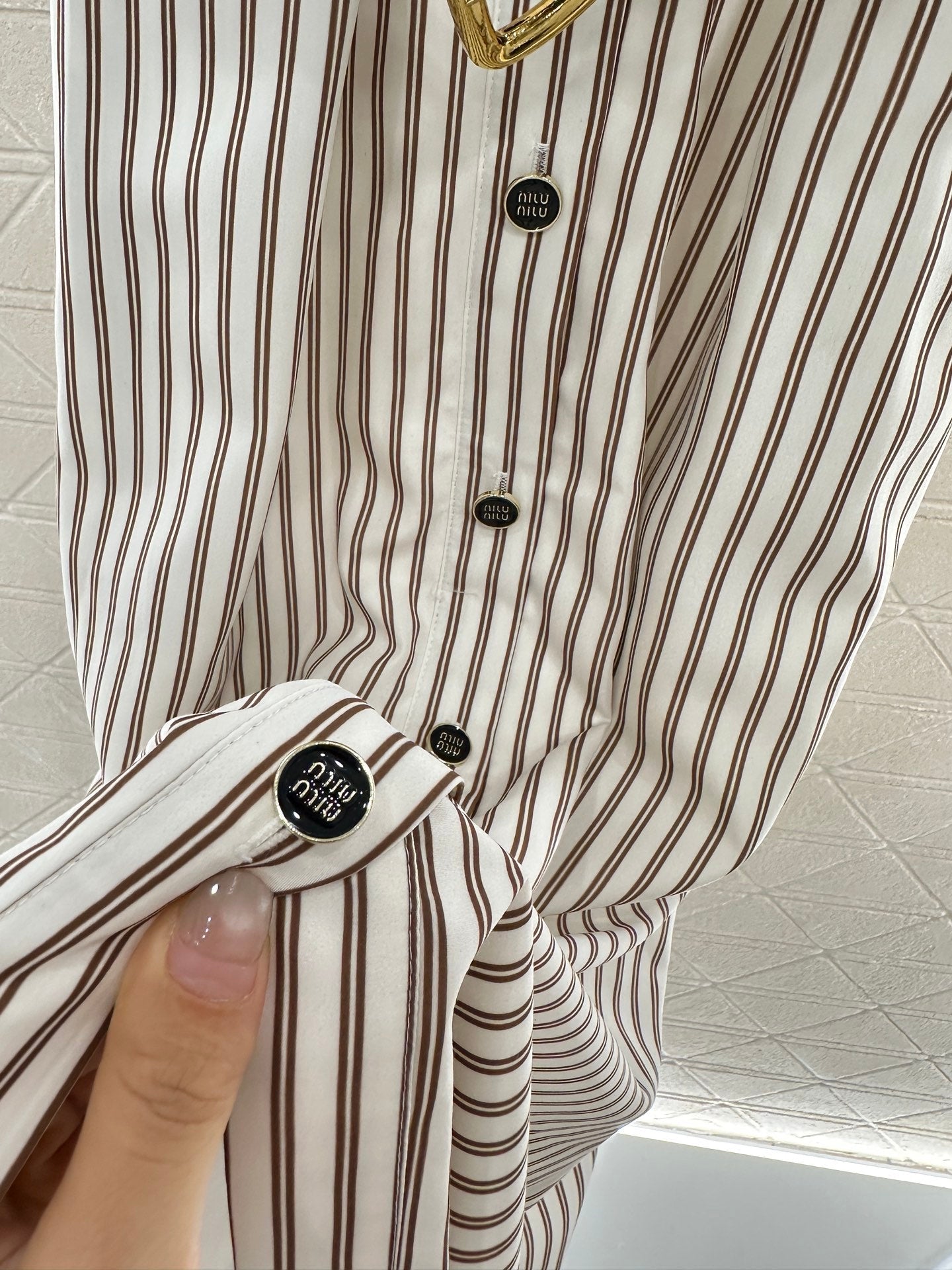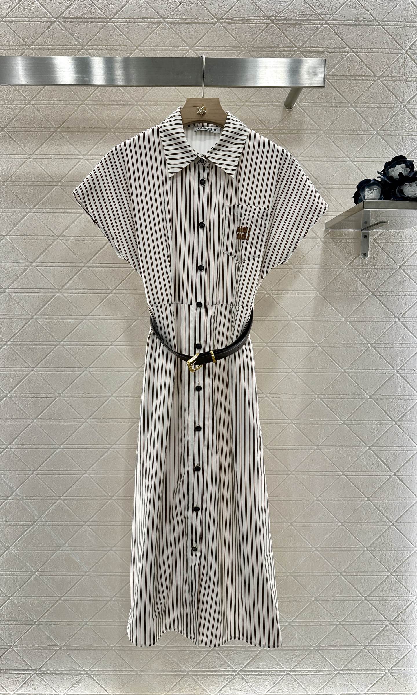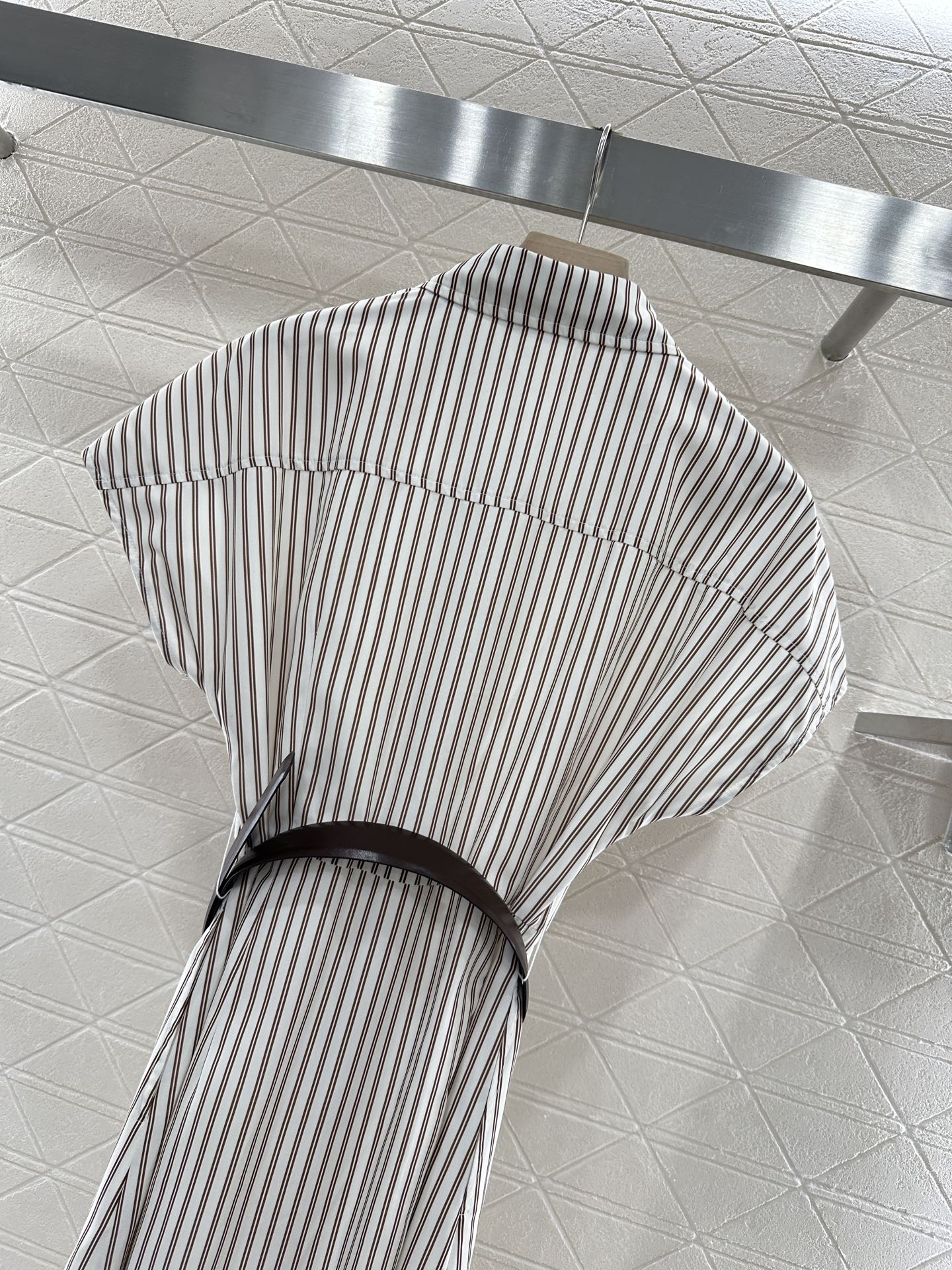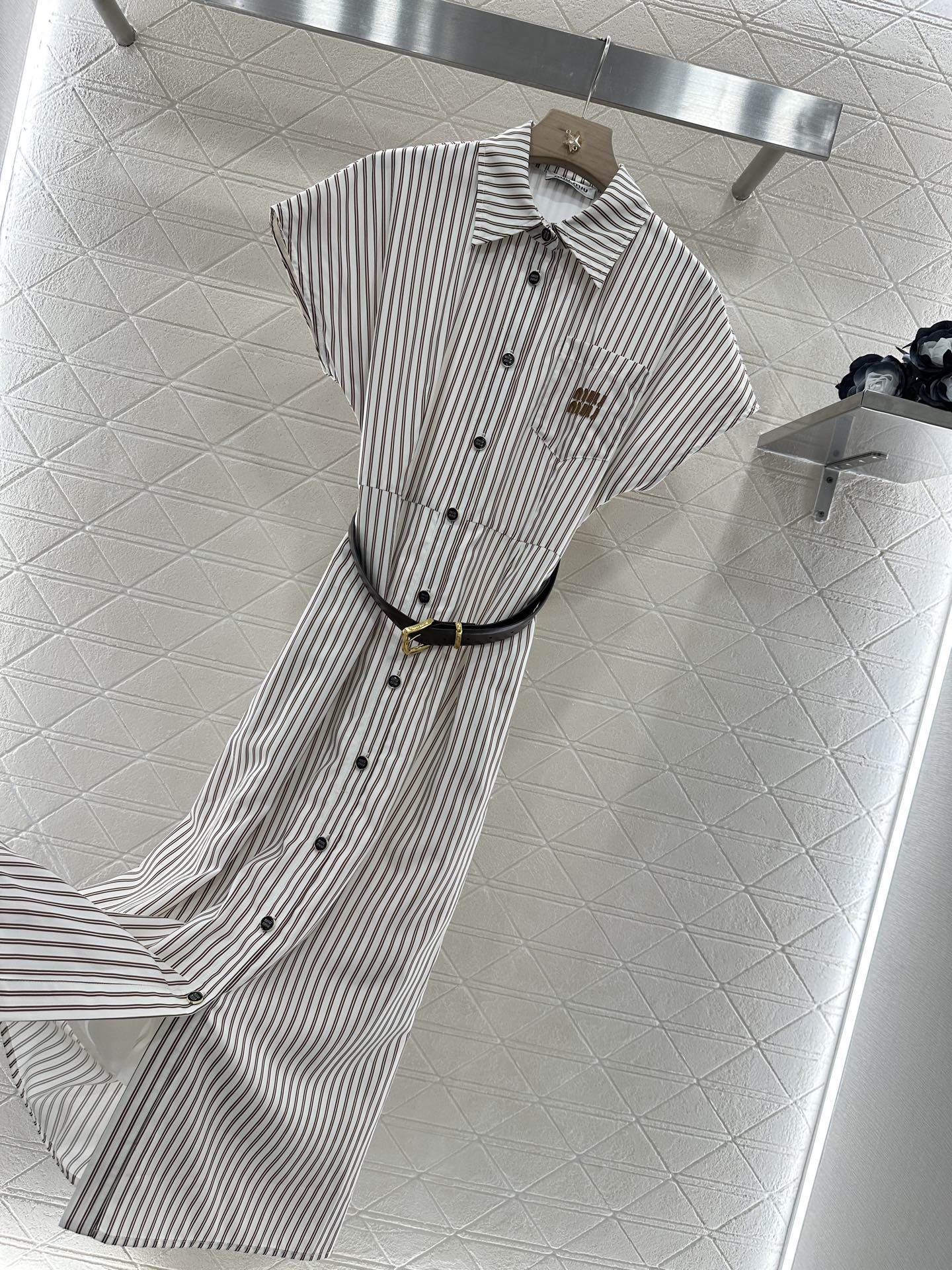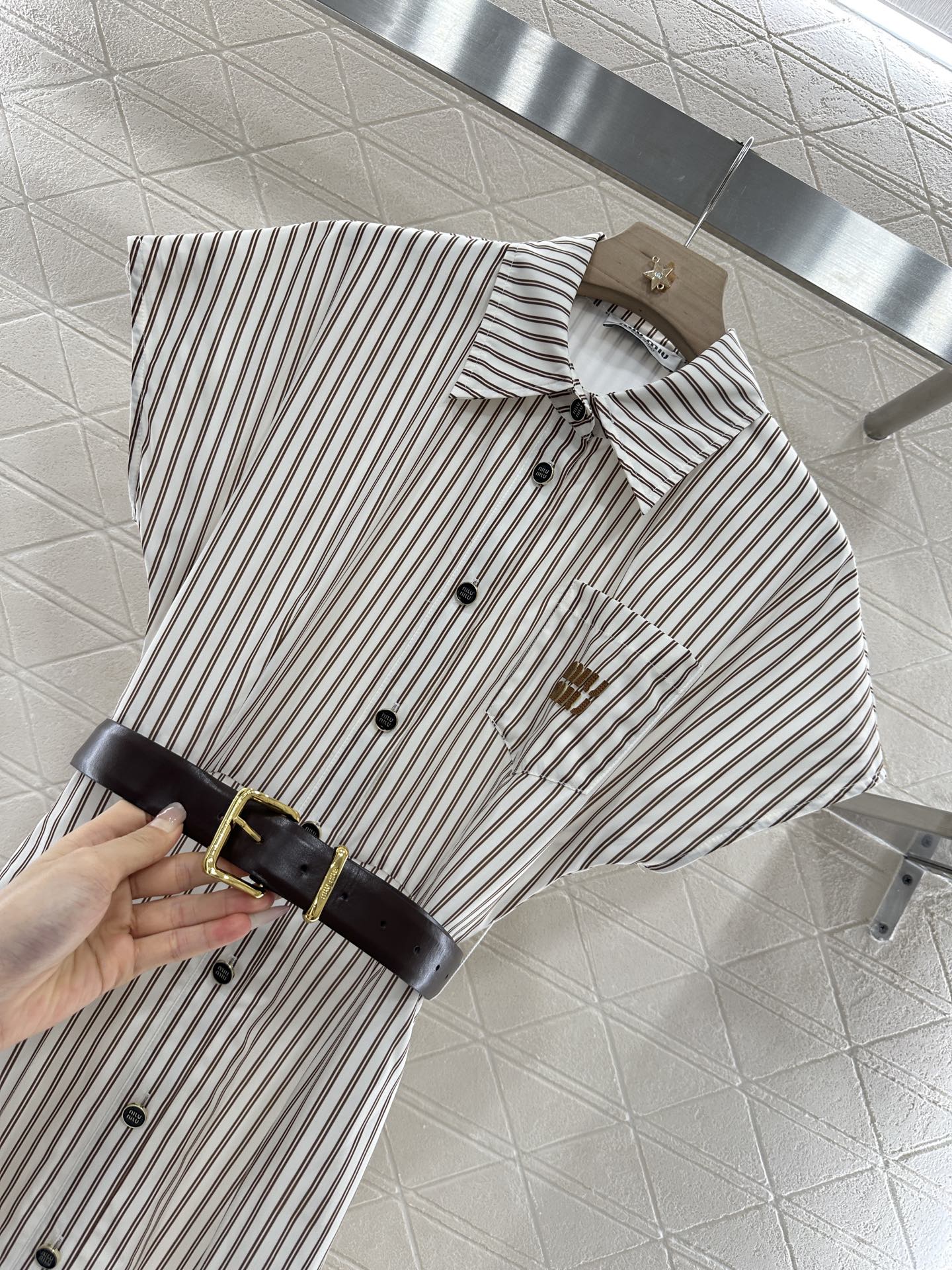 Customized YB imported twill material, comfortable and delicate texture, smooth and stylish, open-front short-sleeved dress cut, vertical stripes all over the body, neat and slim cut, waist-cut to slim the waist, with a belt to highlight the proportion advantage of short top and long bottom, highlighting the exquisiteness of the brand, embroidered logo decoration on one side of the chest, the upper body is full of fashion and elegance, you can wear the dress for daily commuting and vacation to look fashionable