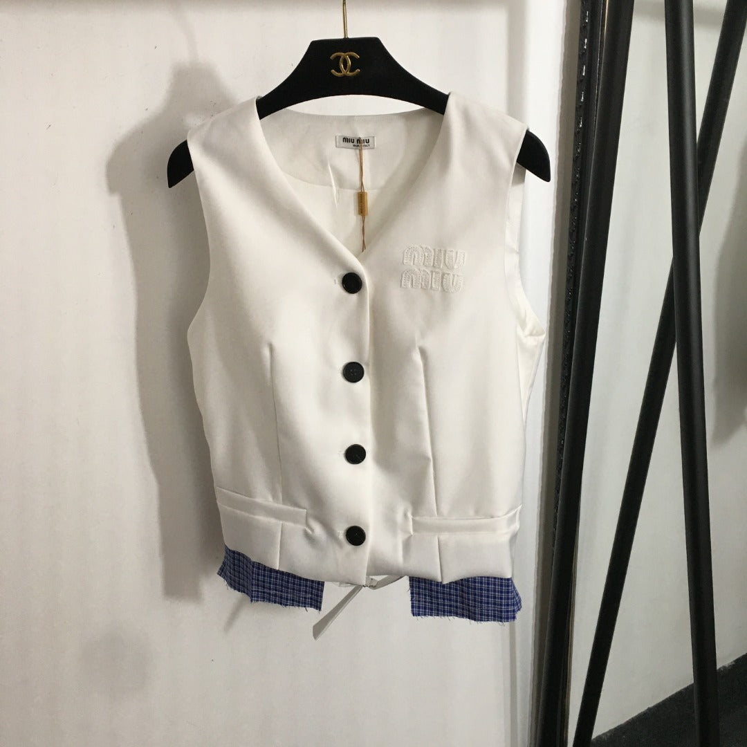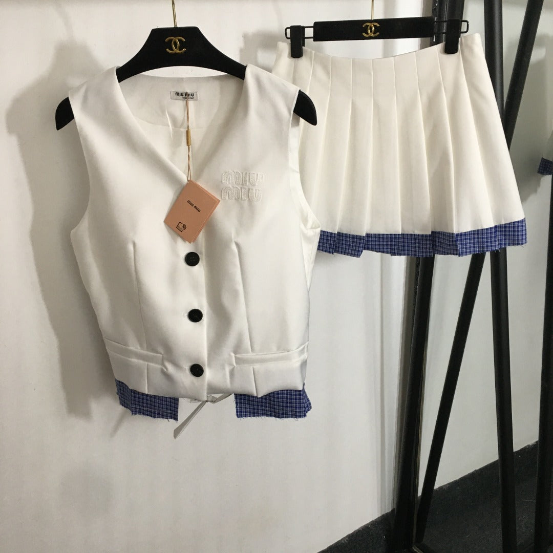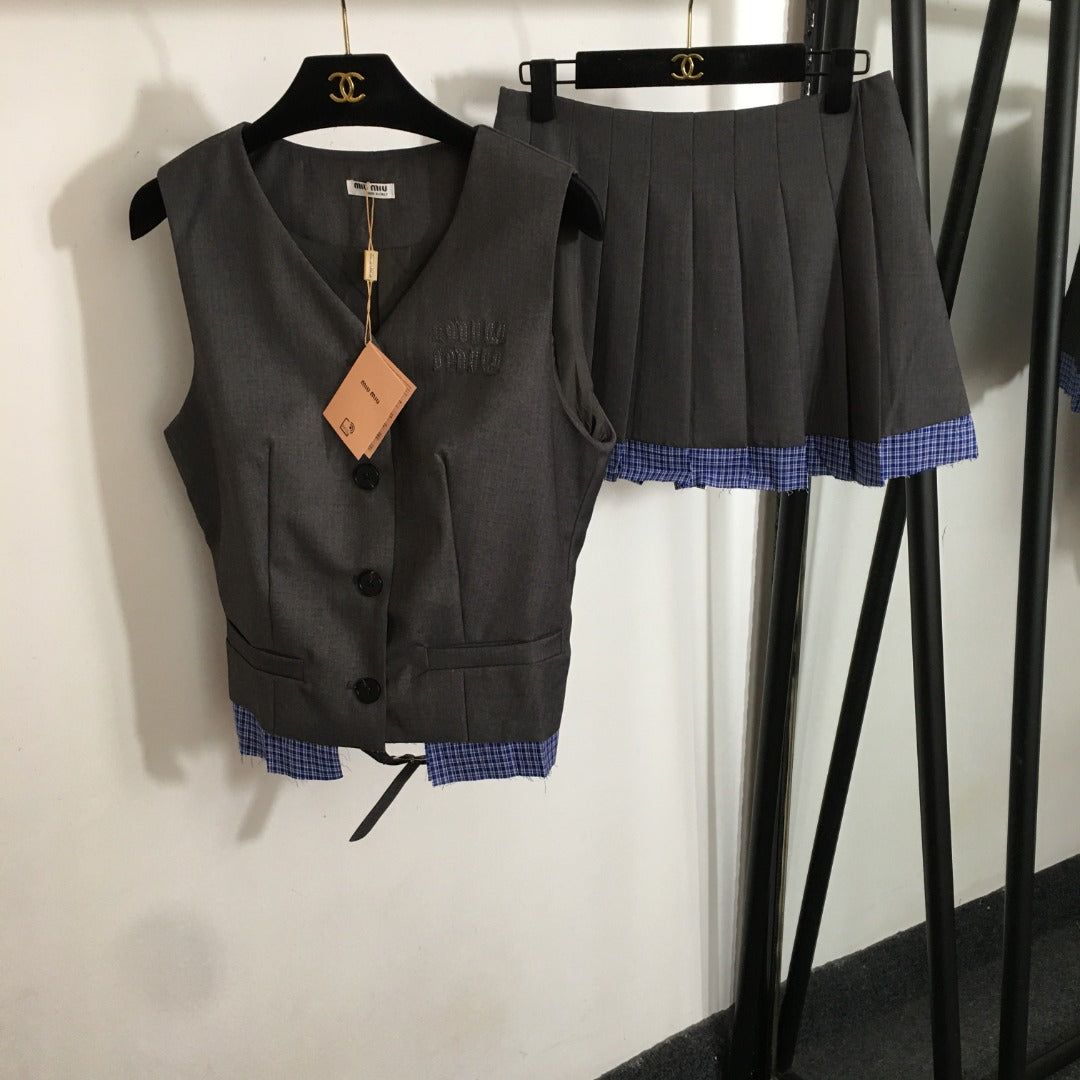 25 Summer new letter logo embroidered patch V-neck suit vest jacket + plaid splicing pleated short skirt suit