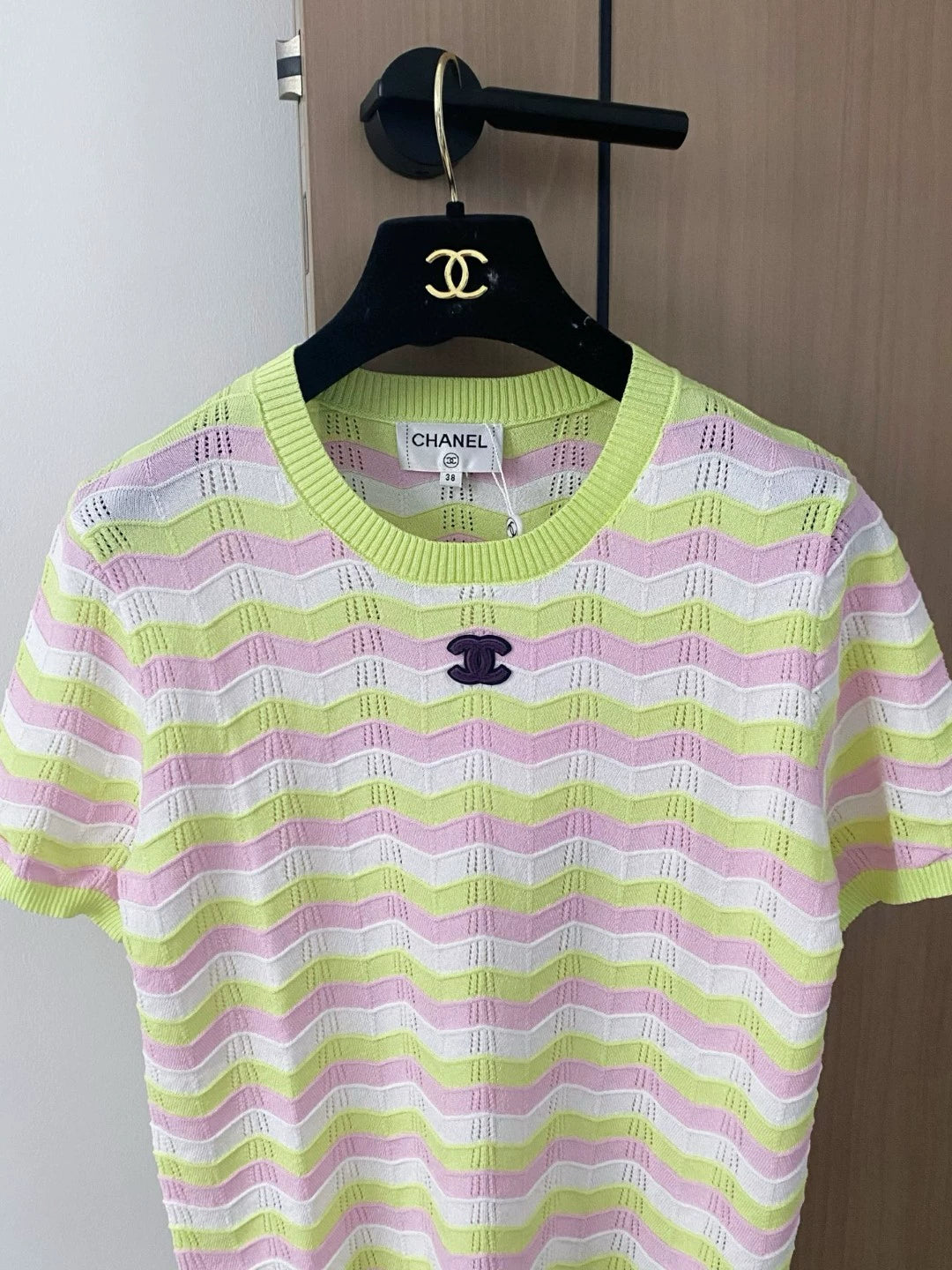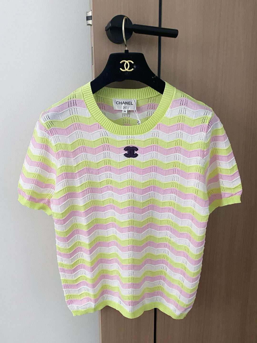 C 25 new color collision striped hollow round neck short sleeve knitting