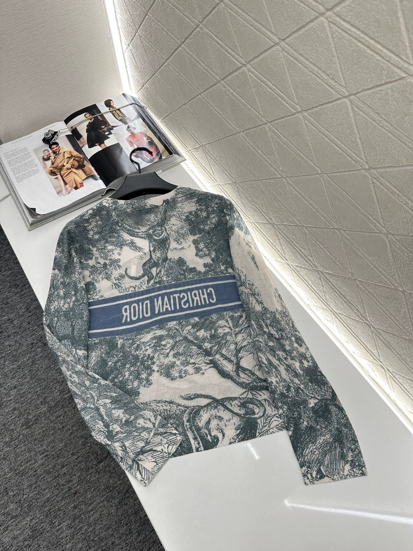 Woven from light, mercerized wool yarn for a refined texture and comfort. Round-neck, long-sleeved base shirt design. Printed with flora and fauna, this piece features a natural jungle design. A horizontal logo on the chest extends to the back, adding a touch of elegance. The slim fit creates a flattering effect. The stretchy material allows for effortless wear. A perfect autumn/winter layering or outerwear option. Stylish and fashionable.