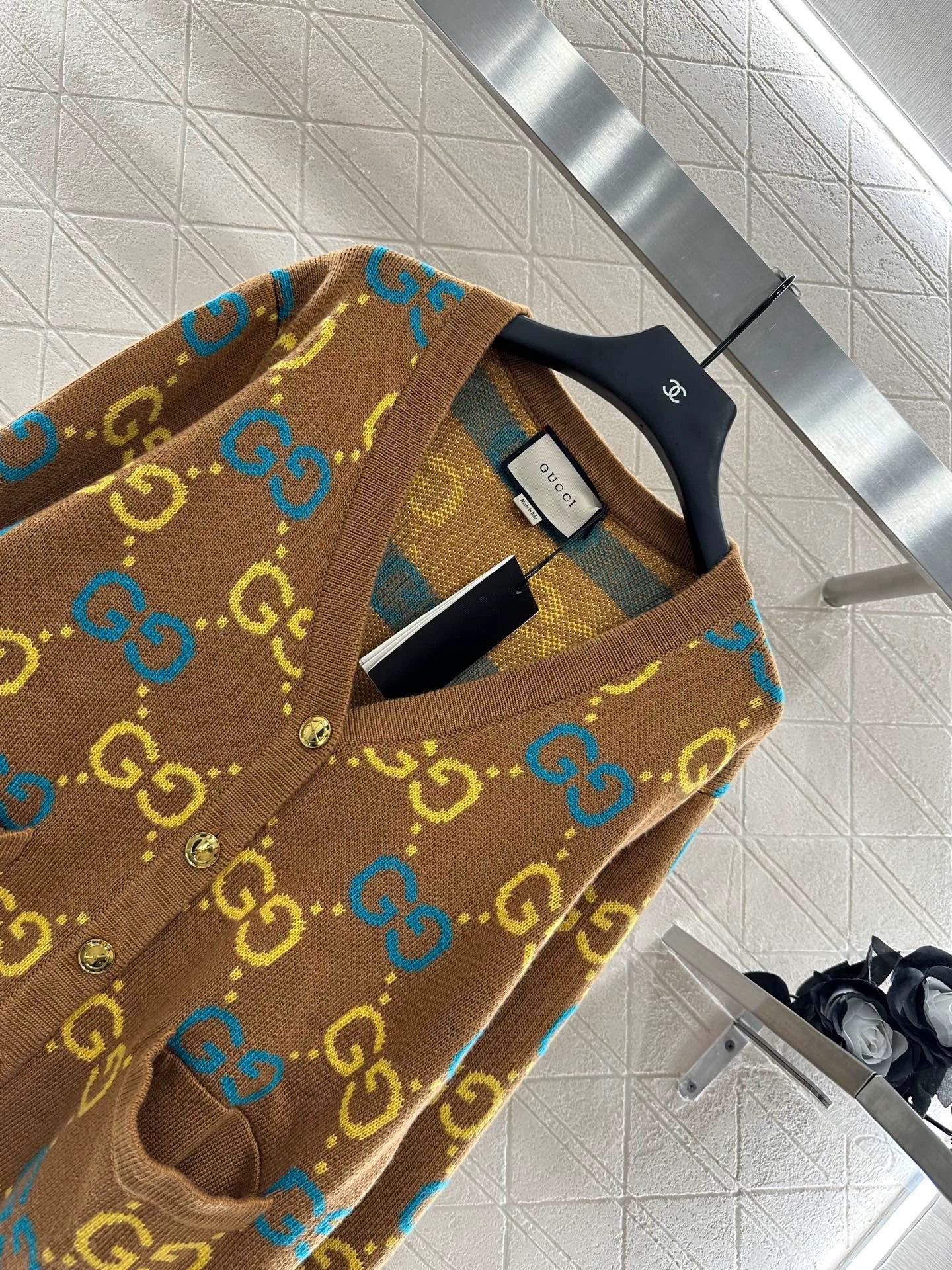 Custom YB wool knit fabric, refined texture, comfortable and easy to wear. V-neck knit cardigan, embellished with molded twist buttons, flattering the neckline and adding a touch of refinement. Contrasting Double G logos throughout. The vibrant color scheme adds a touch of fashion and breaks the dull autumn and winter mood. A stylish and sophisticated look. Custom fabrics and accessories. Look for the latest version.
