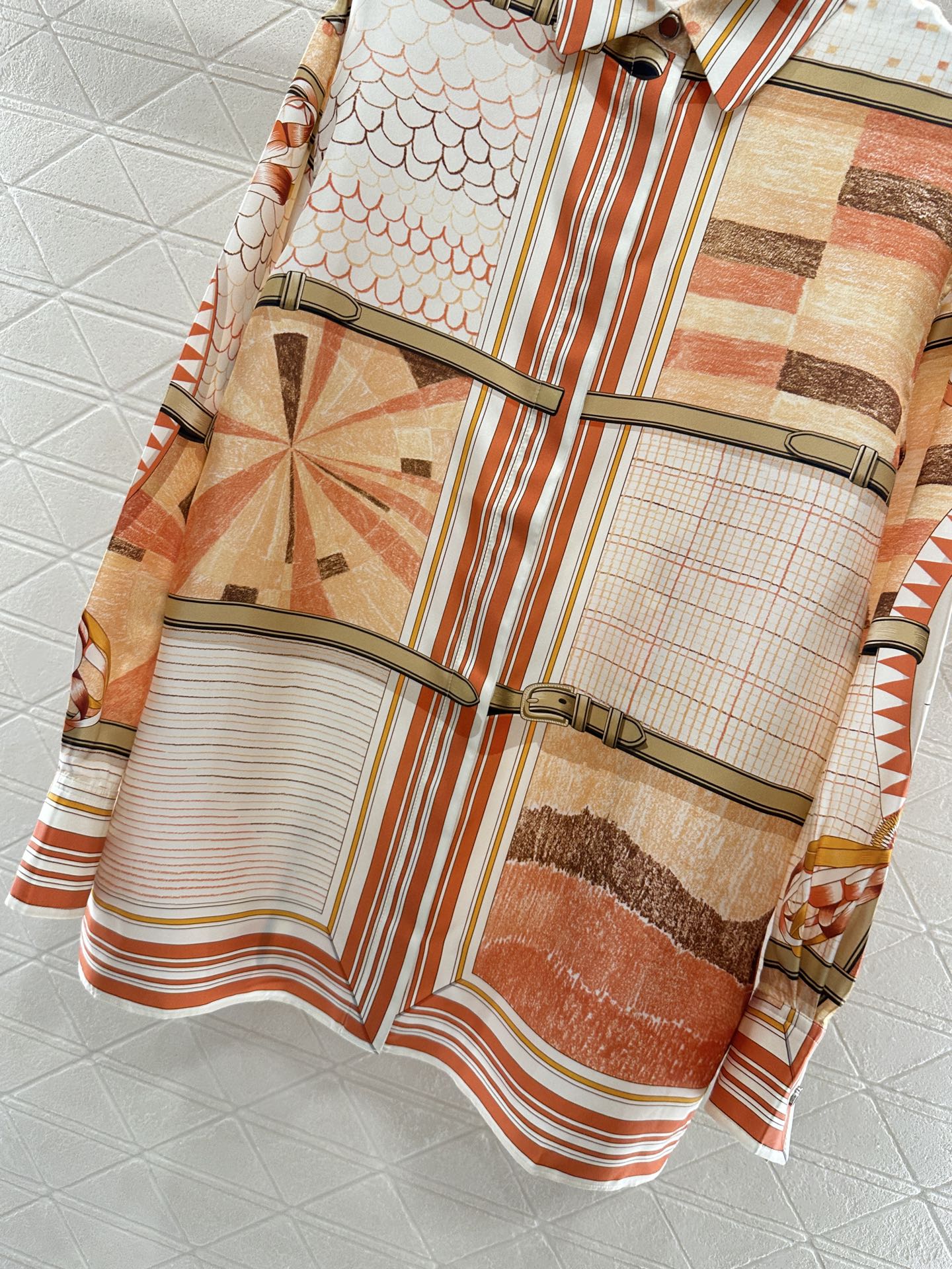 Custom-made YB imported 100% mulberry silk fabric, featuring a lustrous sheen and smooth drape. The long-sleeve oversized shirt is cut with alternating red and orange color blocks, exuding artistic flair. The design incorporates belt-inspired prints to highlight the brand's sophisticated aesthetic. The relaxed fit accentuates a laid-back charm, making it a stylish and elegant choice for any outfit. Custom-made fabric and trimmings Authentic version, high-quality version.