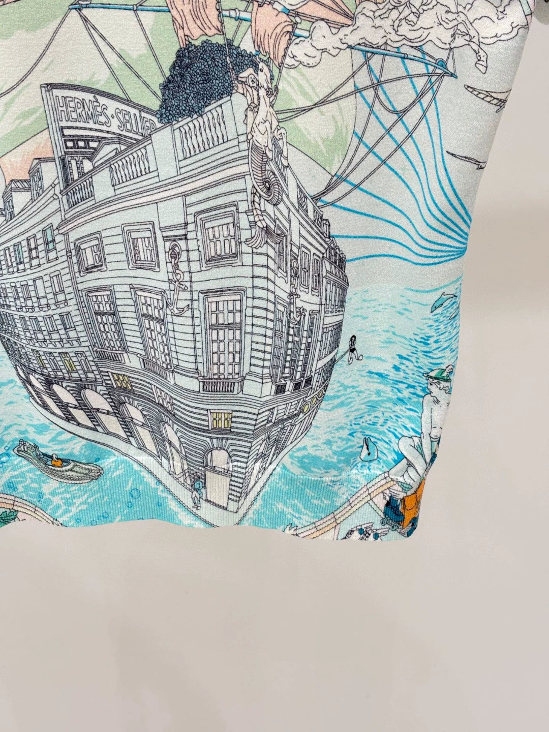 H 25 Early Spring New Round Neck Sailboat Pattern Color Printing Casual Knitted Short Sleeve