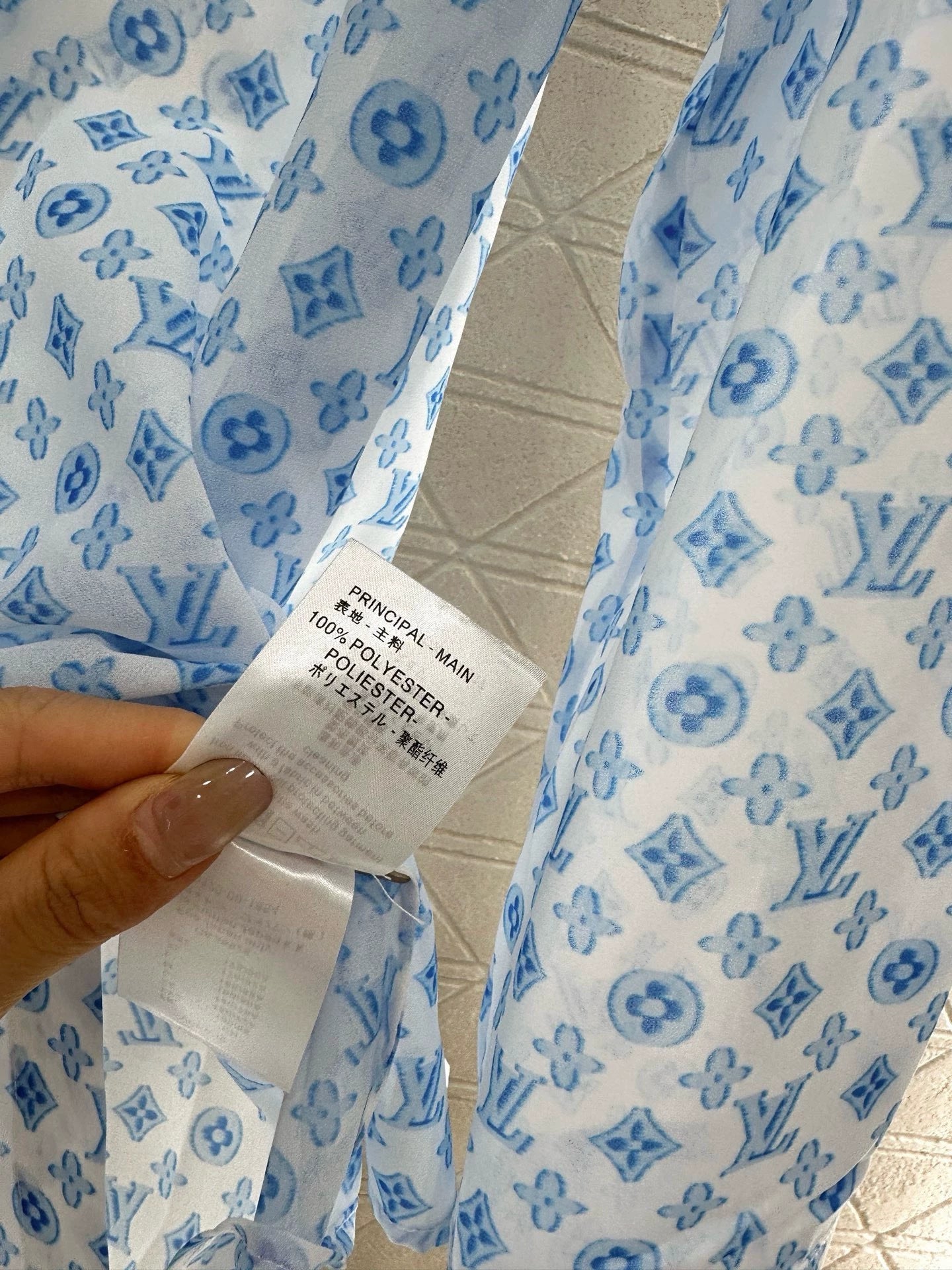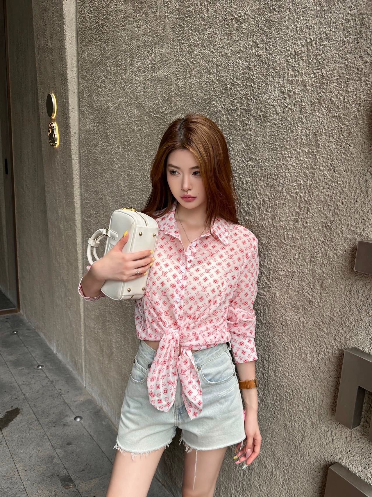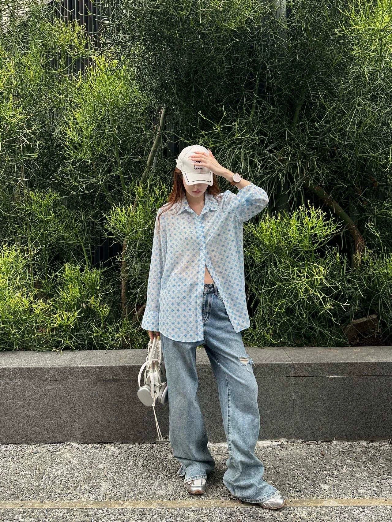 Imported twill thick material texture smooth and comfortable shoulder lapel shirt tailoring medium-length silhouette all over the body printed with four-leaf clover elements and monograms old money loose sense of full top modification of the body temperament elegance fine pointed collar with the front placket single row of buttons decorative