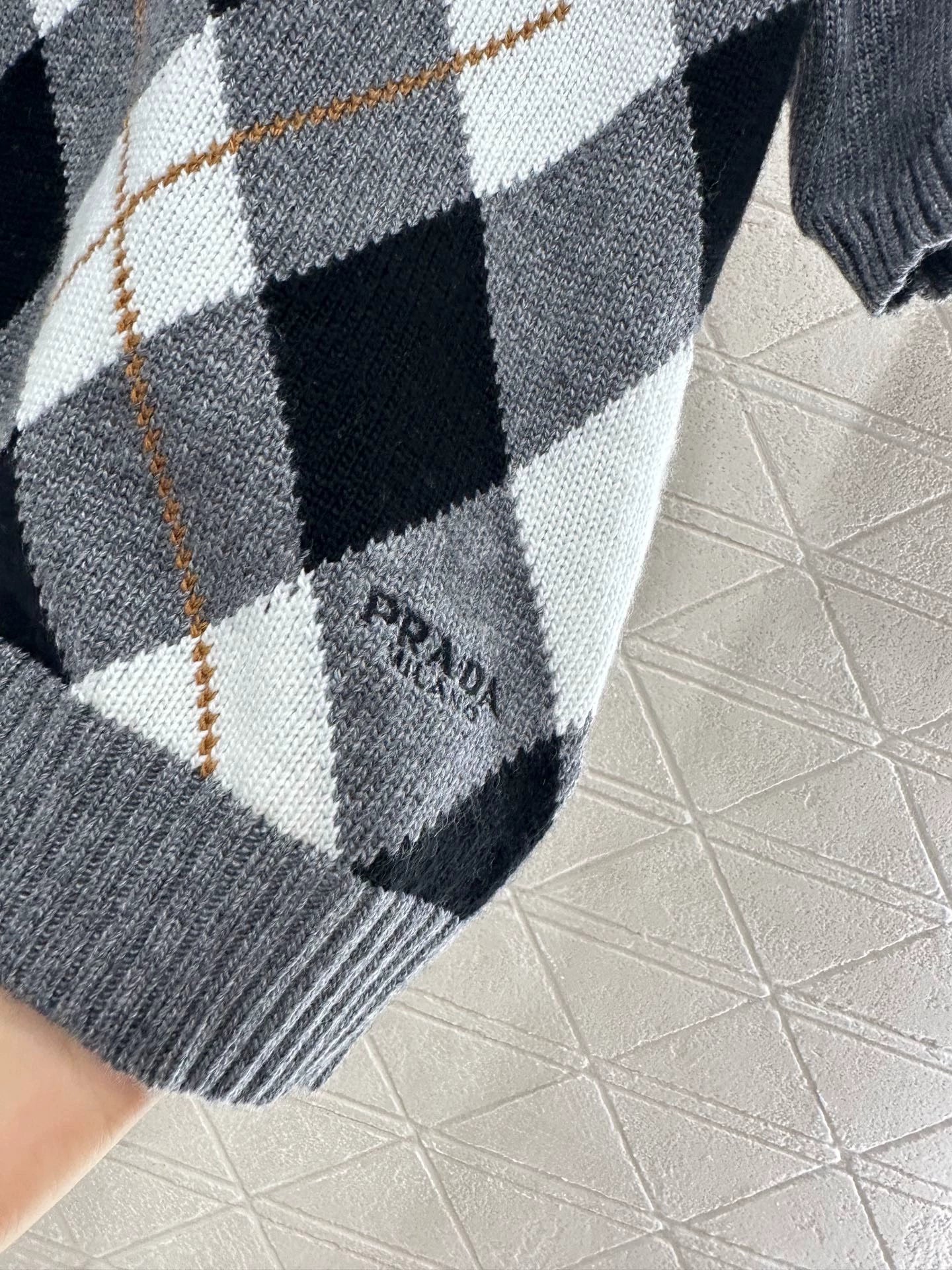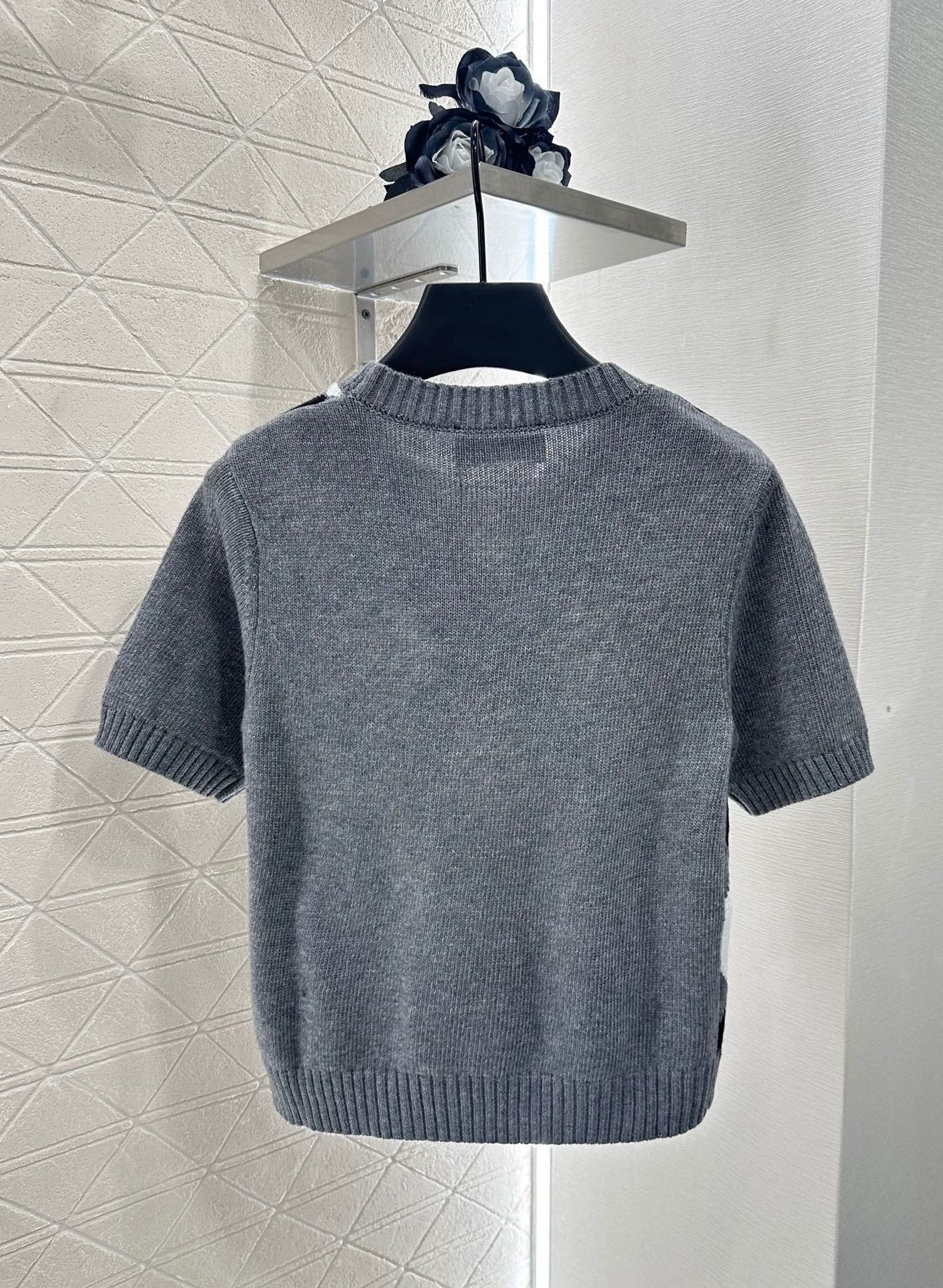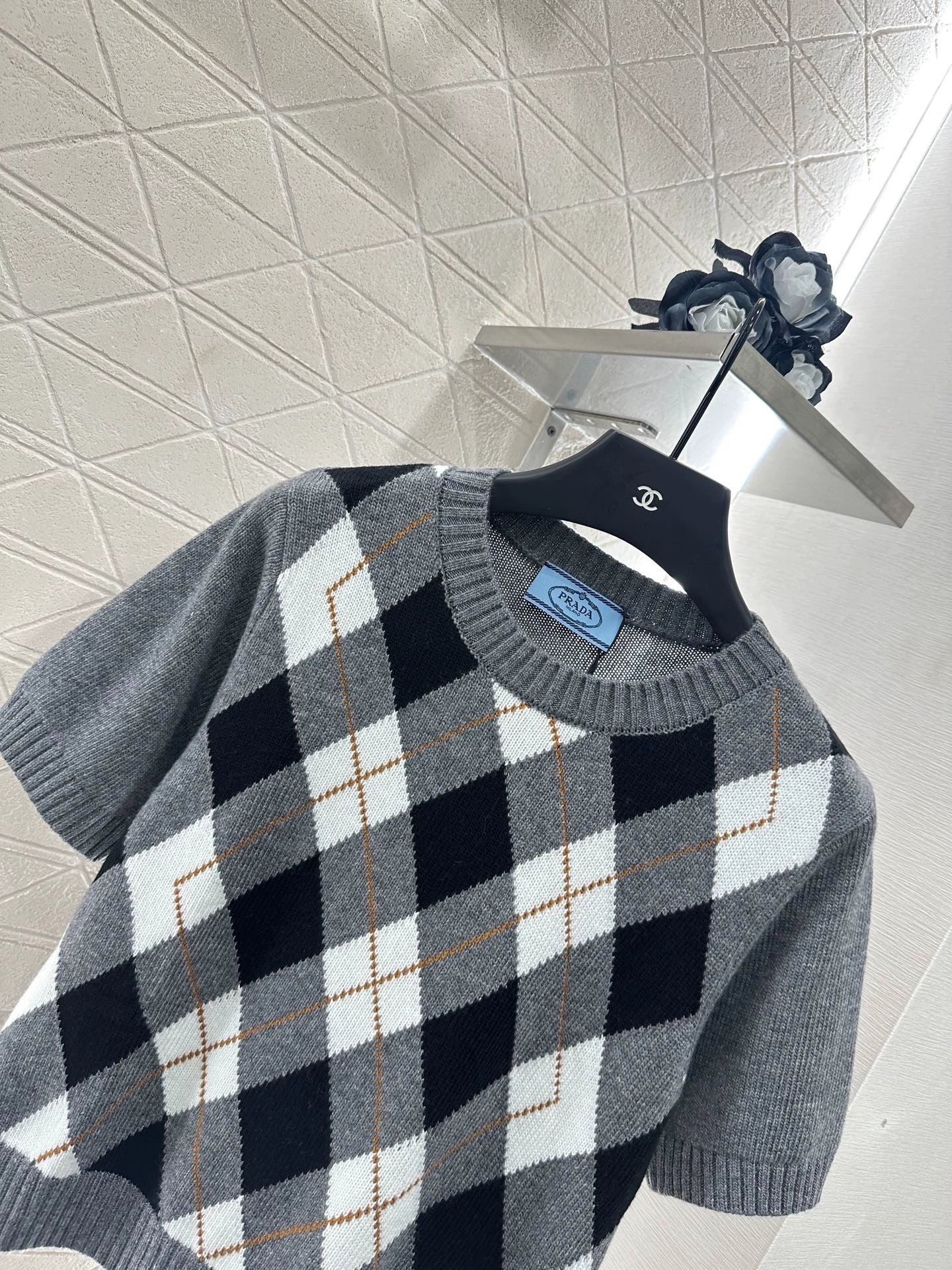Crafted from custom YB wool yarn for a delicate, soft and comfortable feel, this round-neck short-sleeved knit top features spiral-patterned hems at the neckline and cuffs. The light grey body contrasts with the black and white diamond pattern on the chest, adding a youthful, preppy touch. Embroidered monogram logo accents the hem, highlighting the brand's signature style. The artful color scheme exudes British flair. A must-have for dates and commuting. Custom fabrics and accessories. Look for the latest version.