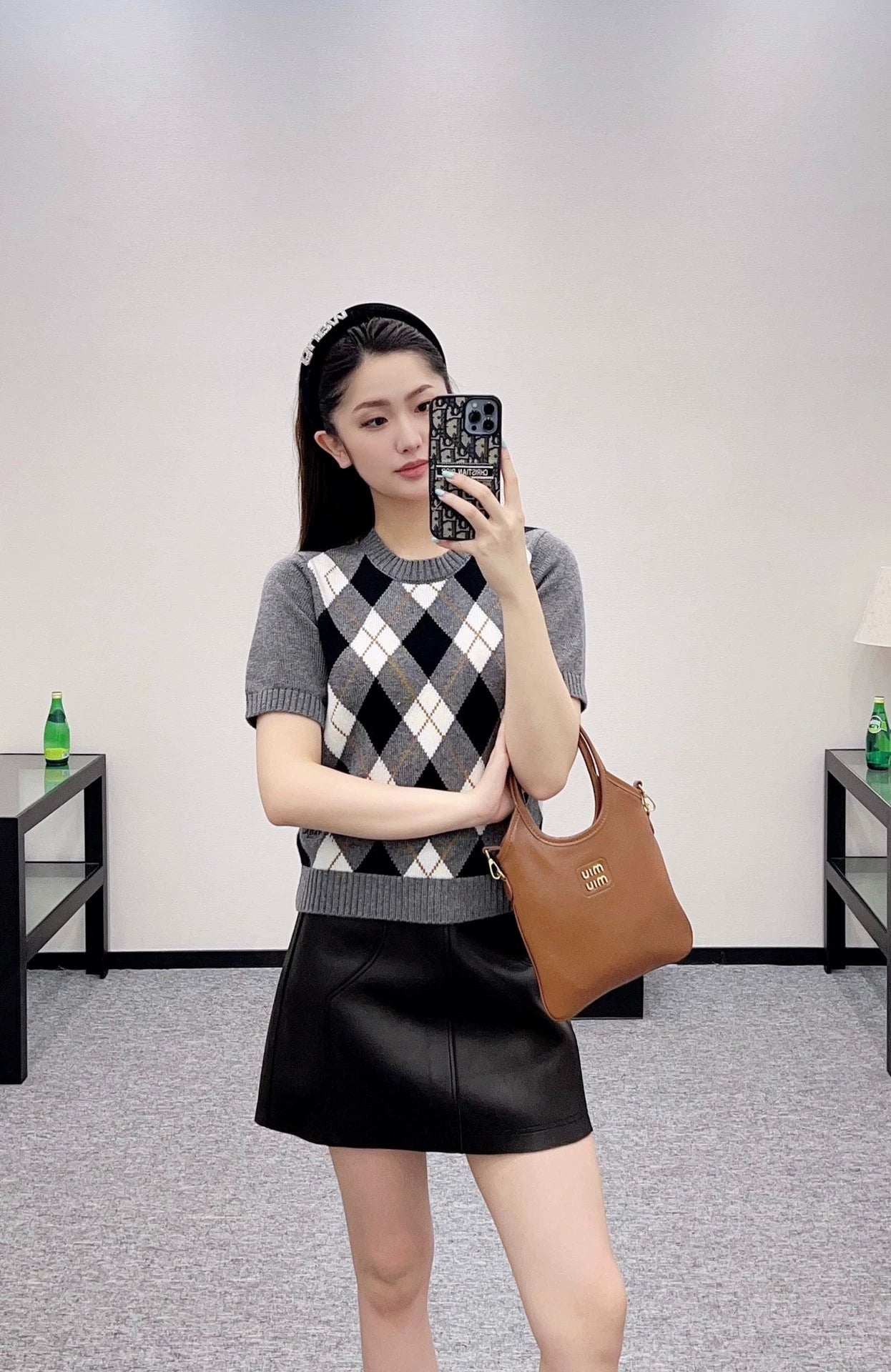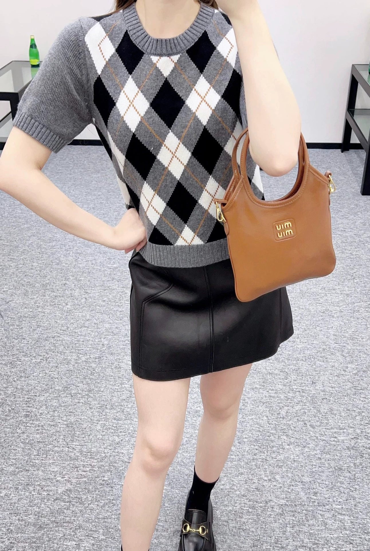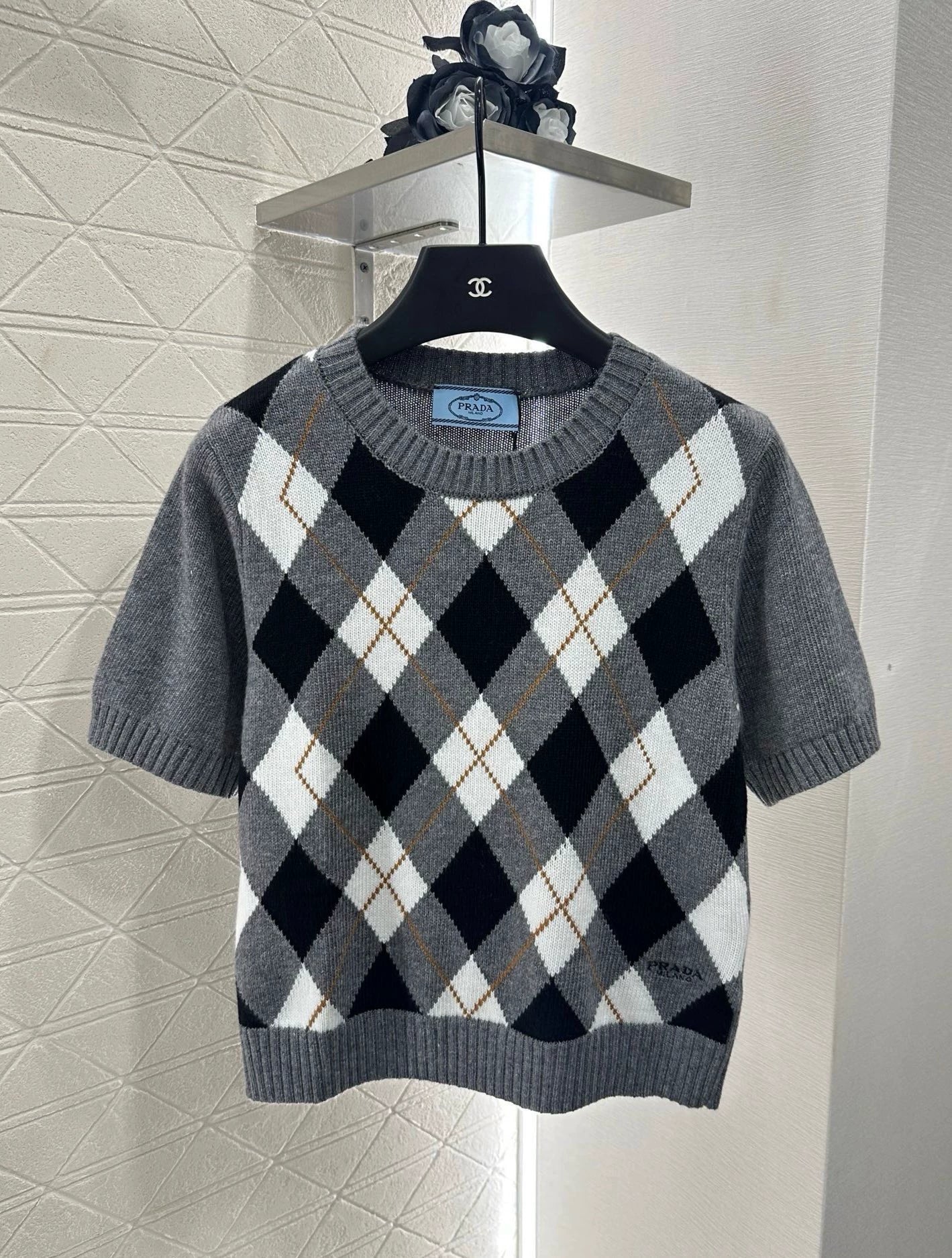 Crafted from custom YB wool yarn for a delicate, soft and comfortable feel, this round-neck short-sleeved knit top features spiral-patterned hems at the neckline and cuffs. The light grey body contrasts with the black and white diamond pattern on the chest, adding a youthful, preppy touch. Embroidered monogram logo accents the hem, highlighting the brand's signature style. The artful color scheme exudes British flair. A must-have for dates and commuting. Custom fabrics and accessories. Look for the latest version.